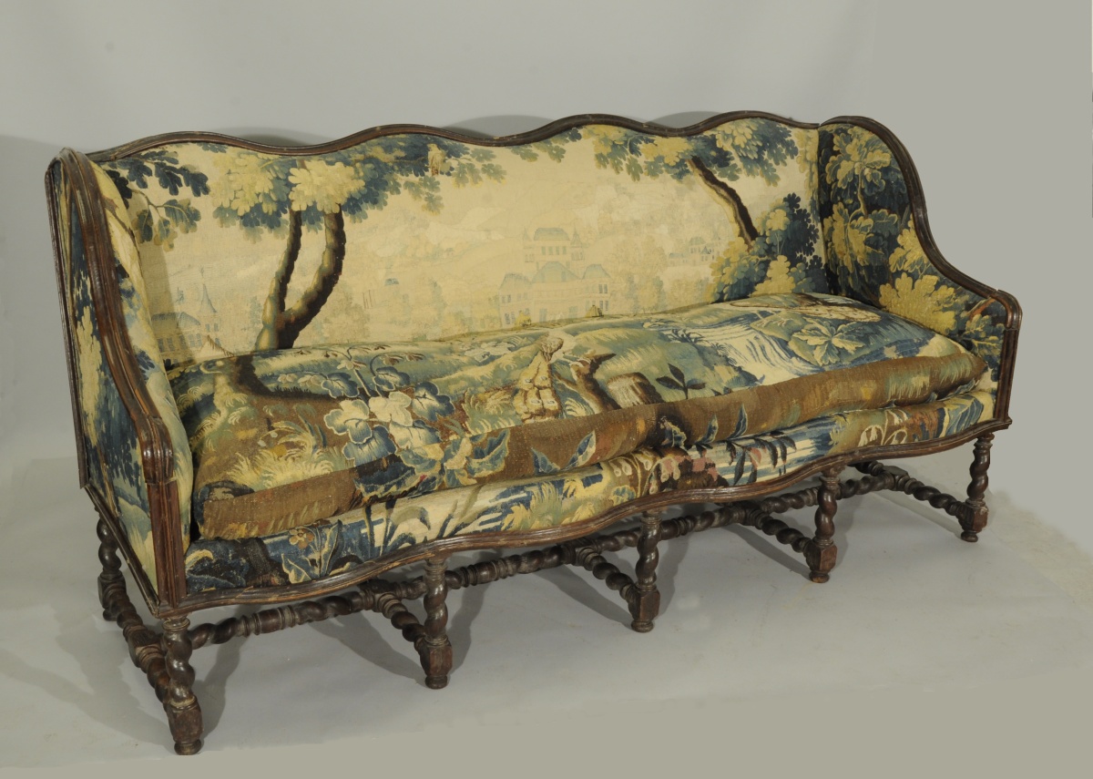 CANAPÉ quatre places à oreilles, en bois naturel mouluré, piétement torsadé recouvert de tapisseries d'Aubusson anciennes.