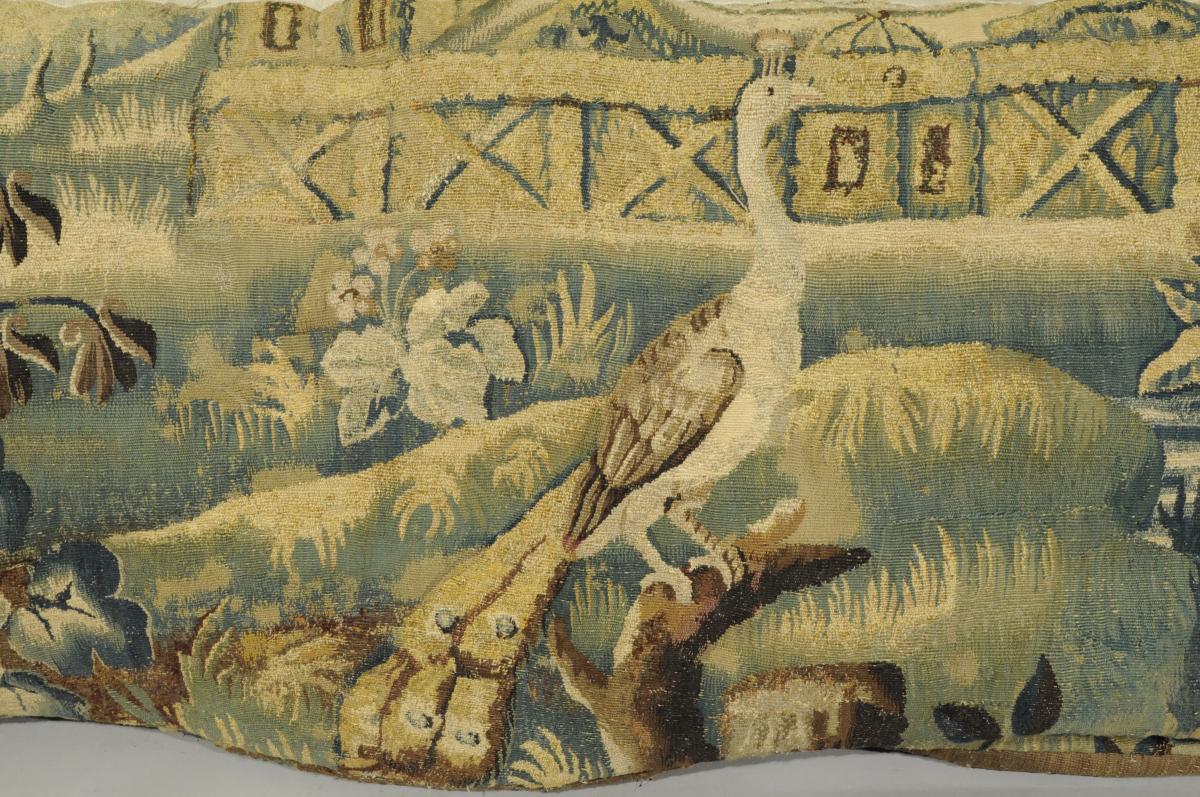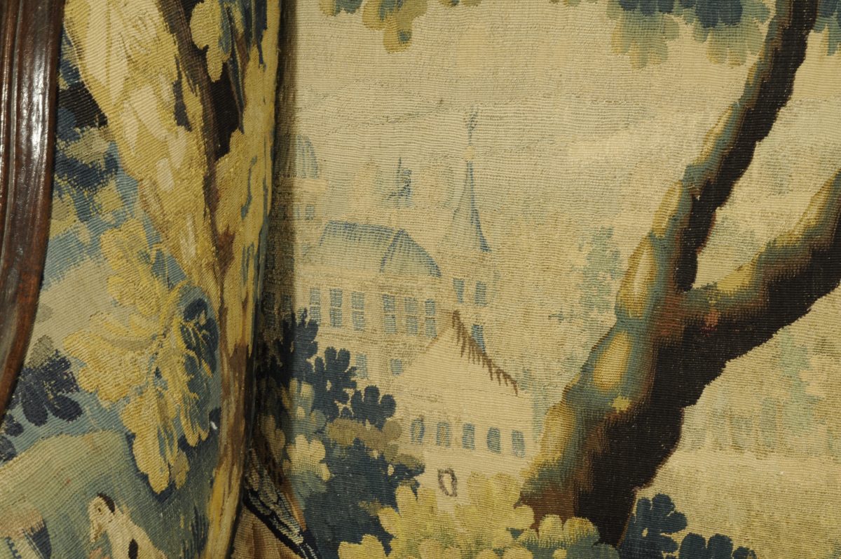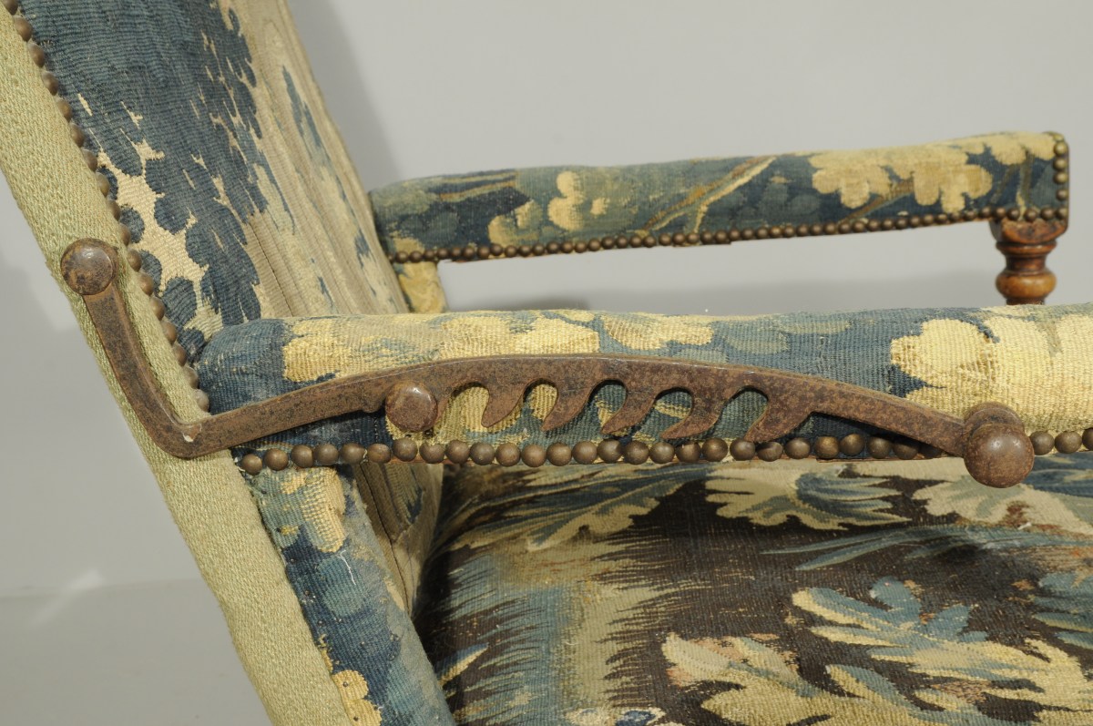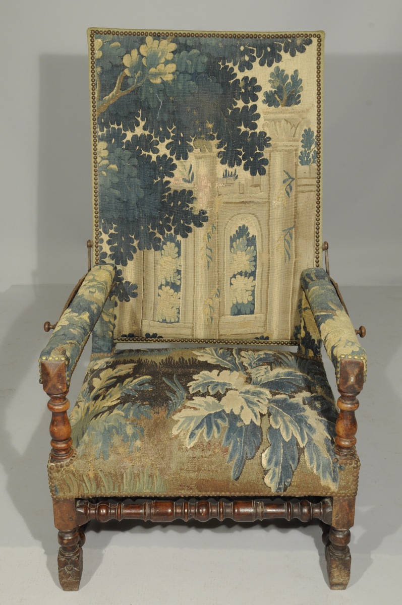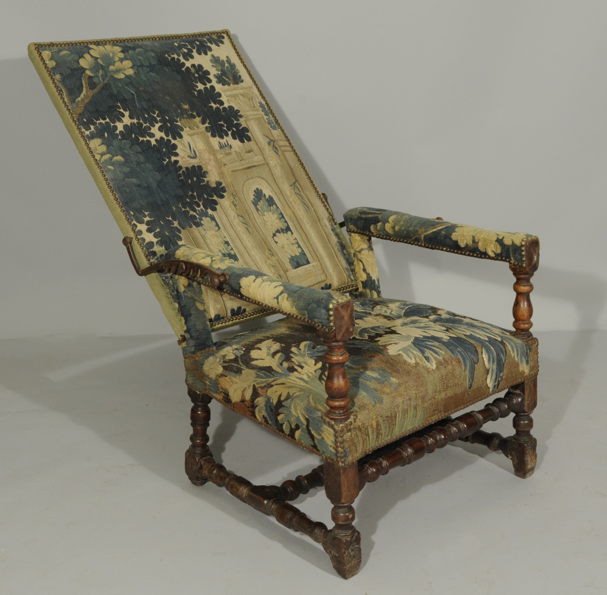 FAUTEUIL À CRÉMAILLÈRE en bois naturel, à haut dossier et accotoirs à manchettes, recouvert de tapisseries d'Aubusson anciennes.