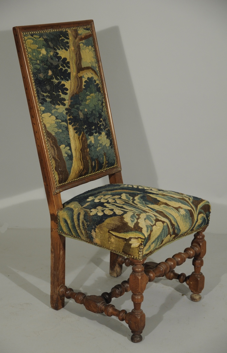 CHAISE en bois naturel à haut dossier de style Louis XIII ancien, recouverte de tapisseries d'Aubusson anciennes.