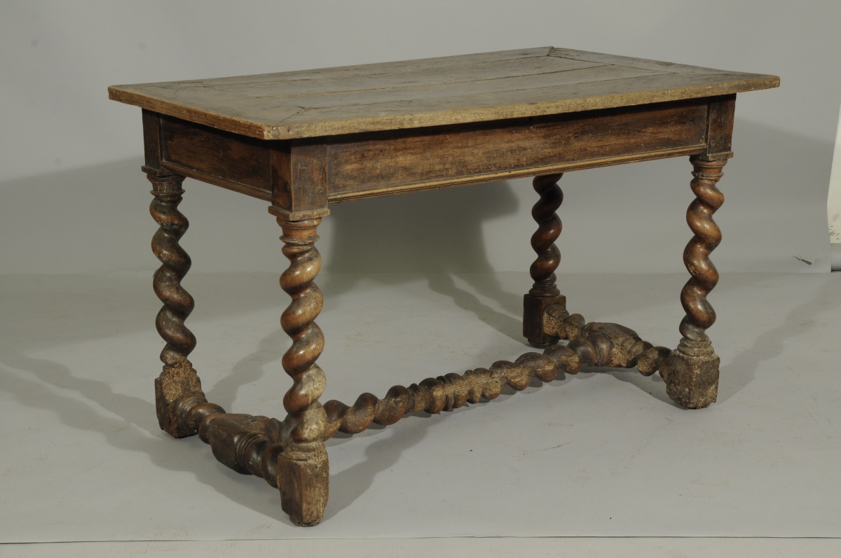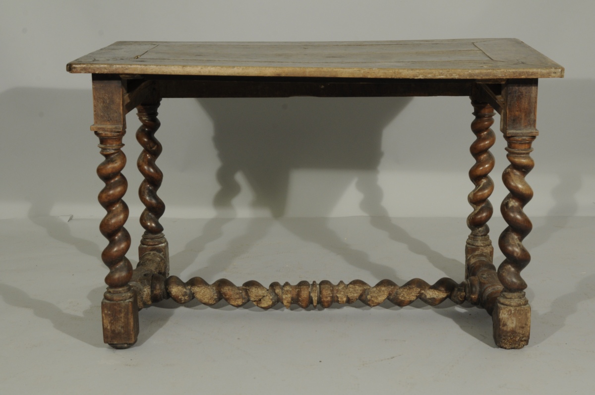 TABLE en chêne reposant sur quatre pieds à colonnes torses, réunis par une entretoise à colonnes torses.