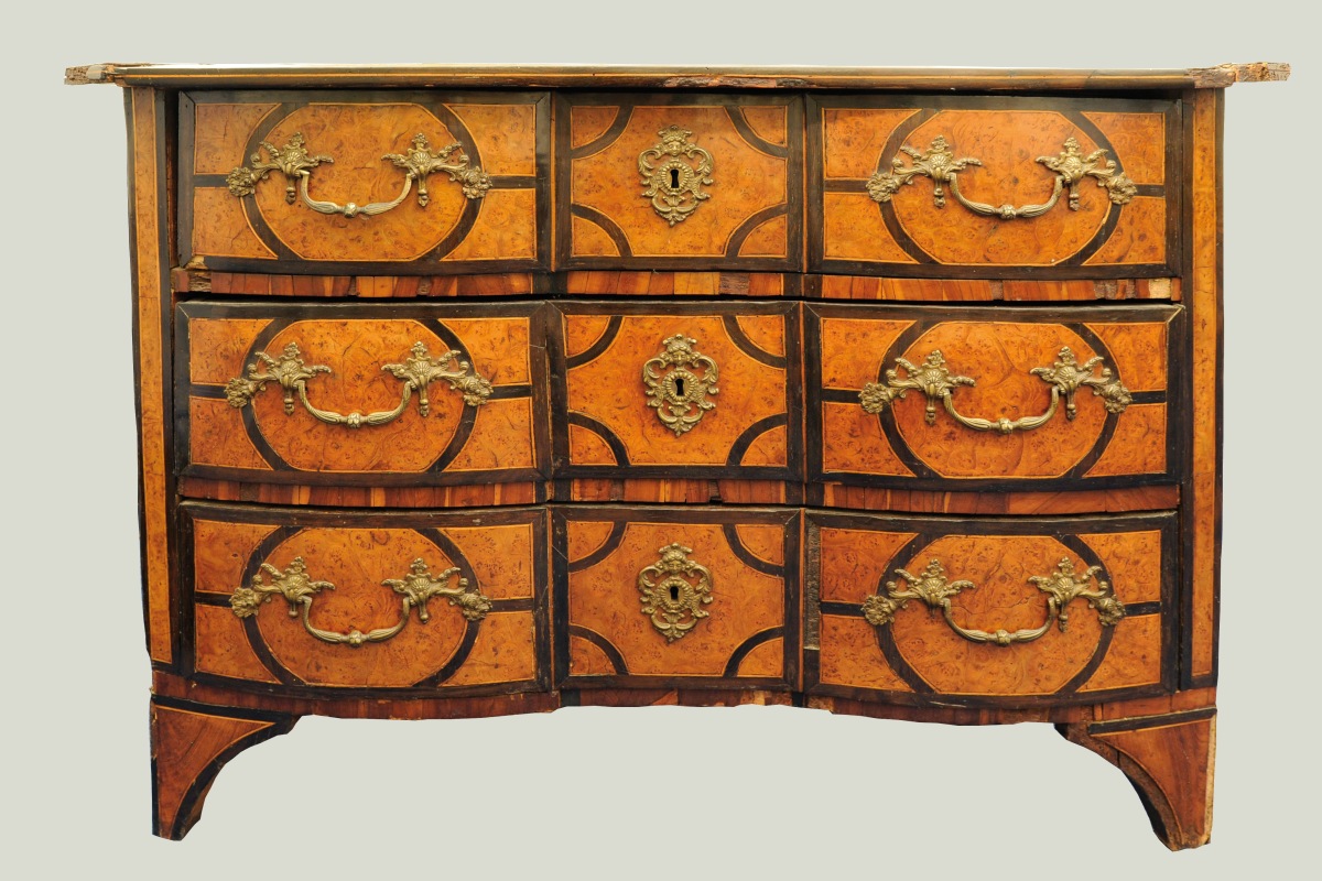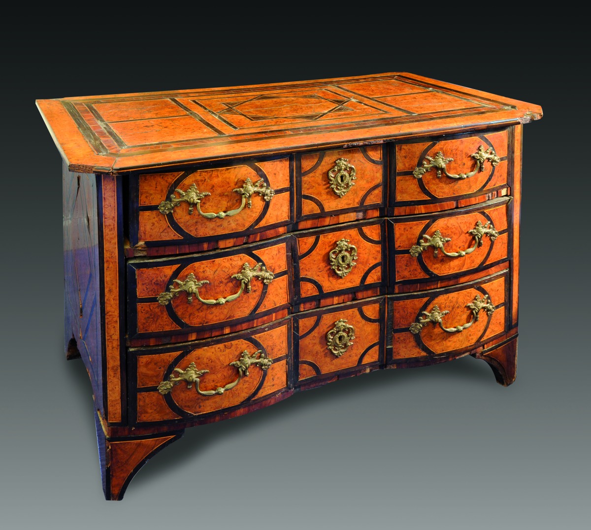 COMMODE en placage de bois indigène, noyer, poirier noirci et filets de bois fruitiers ouvrant en façade à trois tiroirs très légèrement bombés et marquetés de quadrilobes ovalisés. Le plateau à pans coupés est marqueté d'un octogramme, une étoile à huit branches. Les côtés sont ornés d'un losange dans un cartouche rectangulaire. Elle repose sur quatre pieds évasés. Ornementation de bronzes dorés pour les poignées de tirage à motifs de coquilles, sabots et jetés de fleurs et, pour les entrées de serrures, d'indiens panachés.