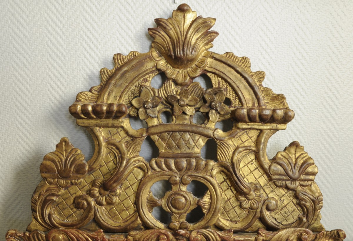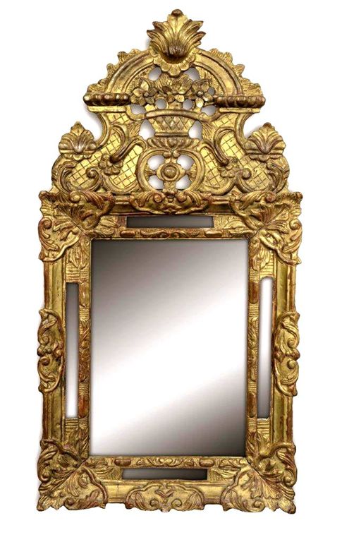 MIROIR À PARE-CLOSES ET FRONTON, de forme rectangulaire en bois stuqué, doré et sculpté de frises de chapelets, rinceaux et feuilles d'acanthe, le fronton orné d'un panier fleuri. Miroirs au mercure.