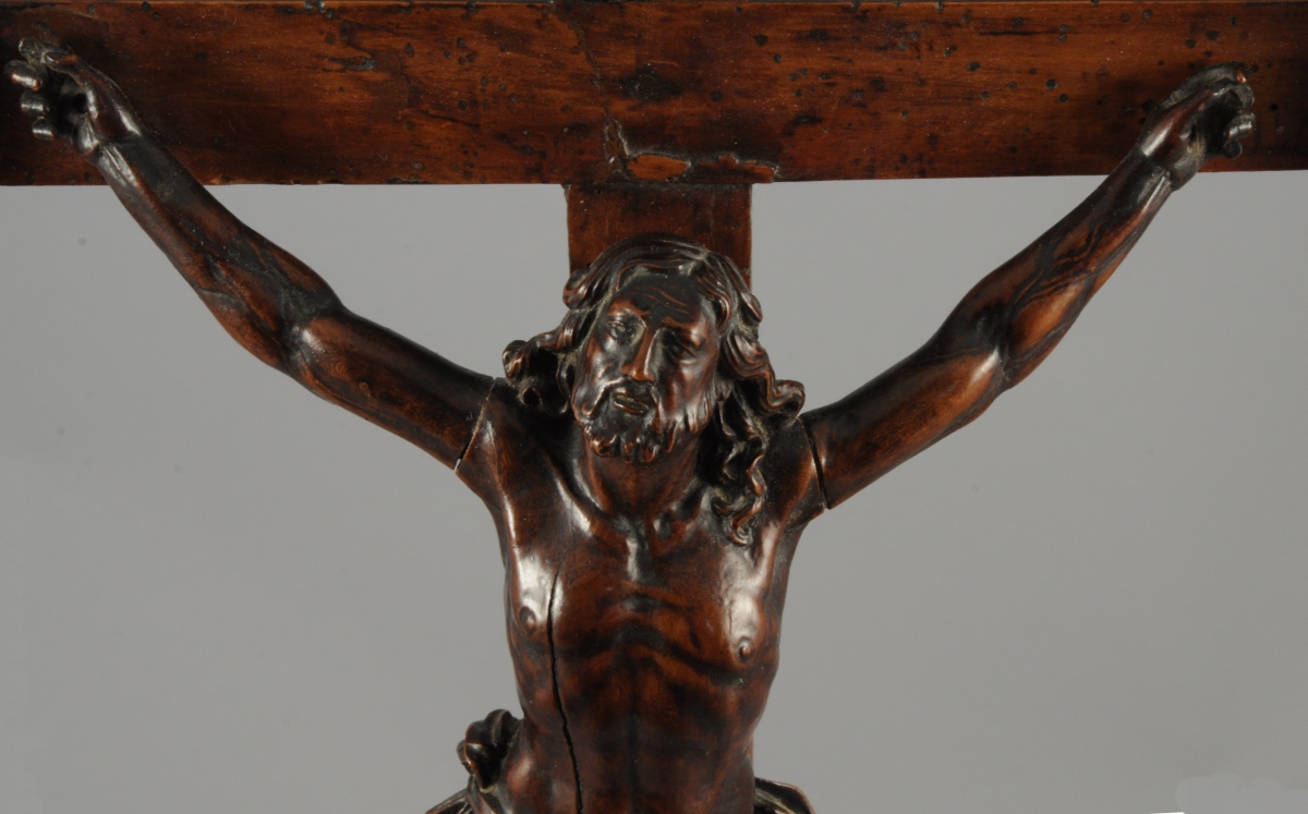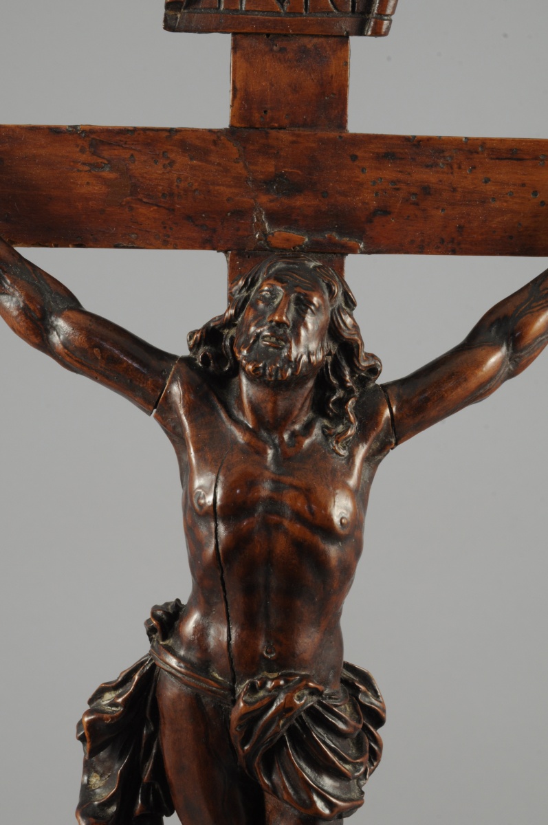 CHRIST en noyer sculpté, cloué sur une croix reposant sur un socle à doucine feuillagée.