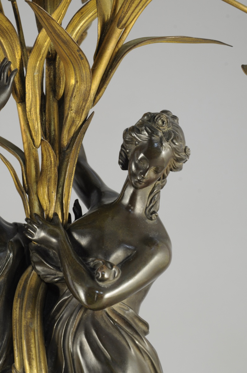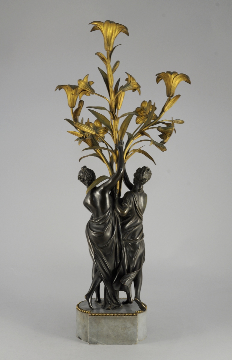 PAIRE DE CANDÉLABRES à trois lumières en bronze ciselé, patiné et doré. Les fûts composés de deux figures de jeunes femmes drapées à l'Antique soutenant une gerbe de lys. Ils reposent sur un socle en marbre bleu turquin orné de rais de perle.