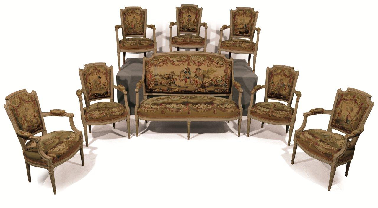Sept fauteuils et un canapé en hêtre mouluré, sculptés et rechampis gris. Dossier cabriolet en chapeau de gendarme et, feuilles d'acanthe à l'amortissement des montants. Les accotoirs se terminant en volutes reposent sur des consoles galbées. Dés de raccordement sculptés de fleurons. Pieds fuselés et cannelés.