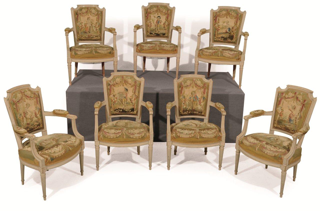 Belle garniture combinée en tapisserie d'Aubusson. Les assises d'après les dessins des Fables de La Fontaine par Jean-Baptiste Oudry: le Renard et la Cigogne (2) ; le Corbeau et le Renard ; les deux Chèvres ; le Chien qui lâche sa proie pour l'ombre ; le Chat, la Belette et le Petit Lapin ; le Chat et les deux Moineaux. Les dossiers d'après les enfants jardiniers de François Boucher, dont Le petit architecte.