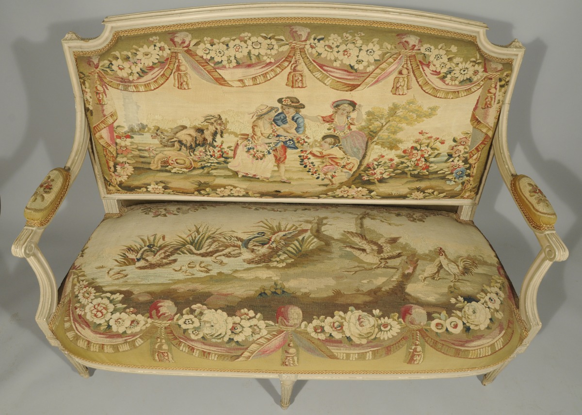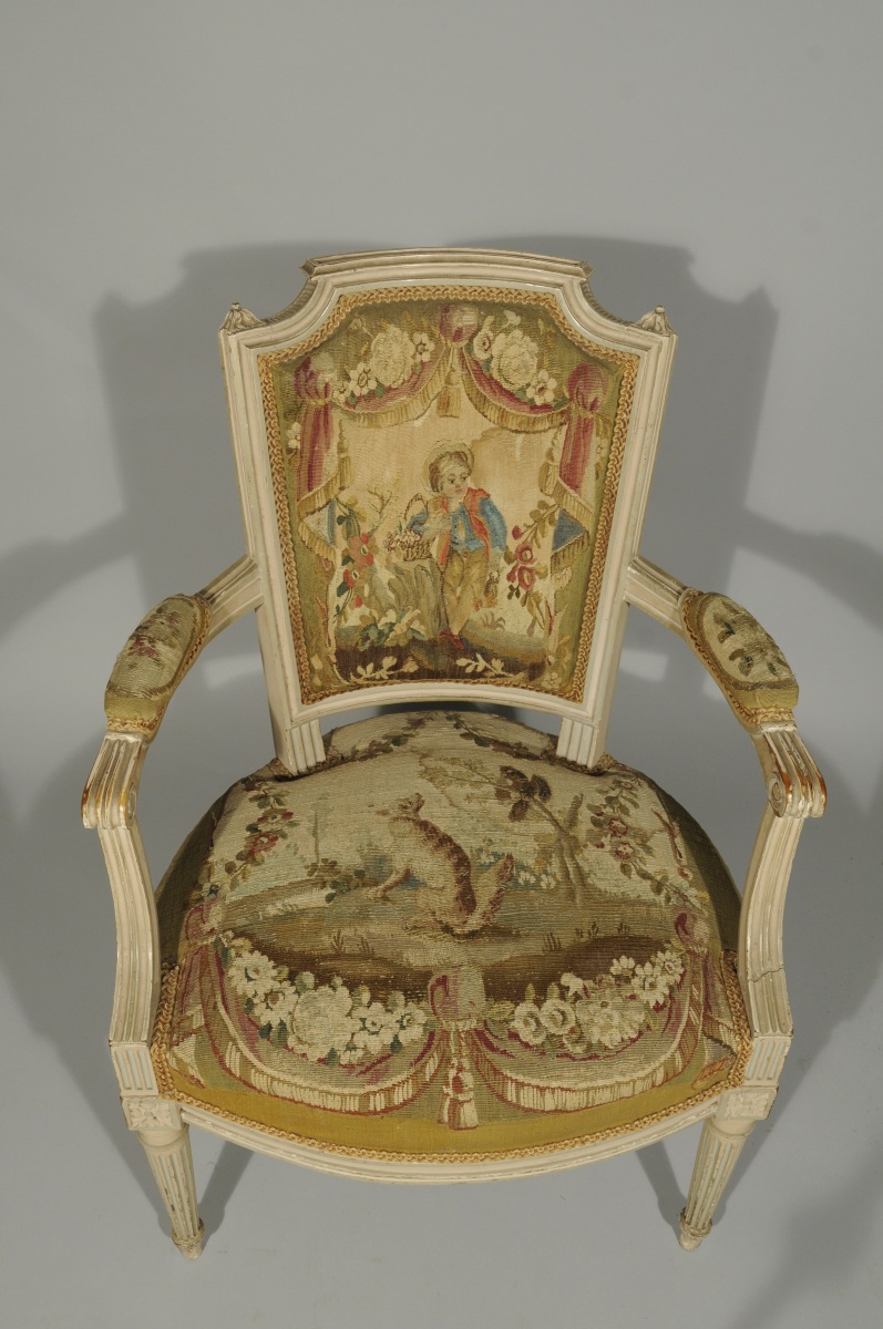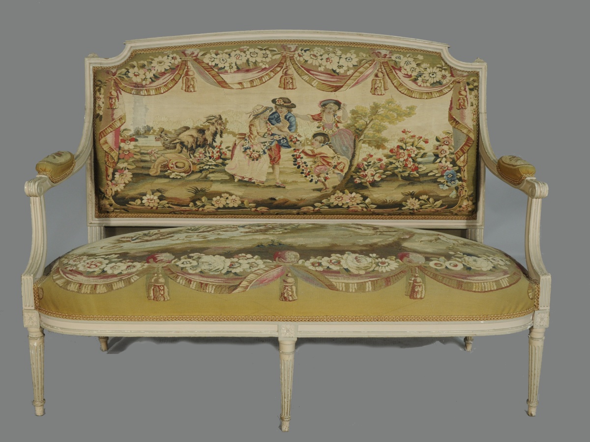 Les figures enfantines que l'on retrouve sur les dossiers de ce salon ont été réalisées d'après les dessins de François Boucher (1703 - 1770). Le peintre développe le thème des enfants jardiniers à partir de 1750, sous l'influence de la Marquise de Pompadour et de son entourage. Les enfants vaquent à des occupations de grandes personnes, évoluant dans un univers idéalisé dont ils sont les maîtres. "Le Petit architecte" appuyé sur son instrument de mesure se retrouve sur l'un des quatre panneaux peints par Boucher pour le château de Sceaux, présentés en 2006 lors de la vente annuelle à Cheverny.