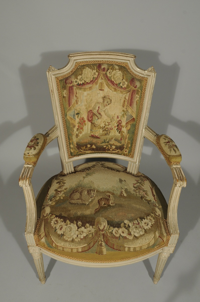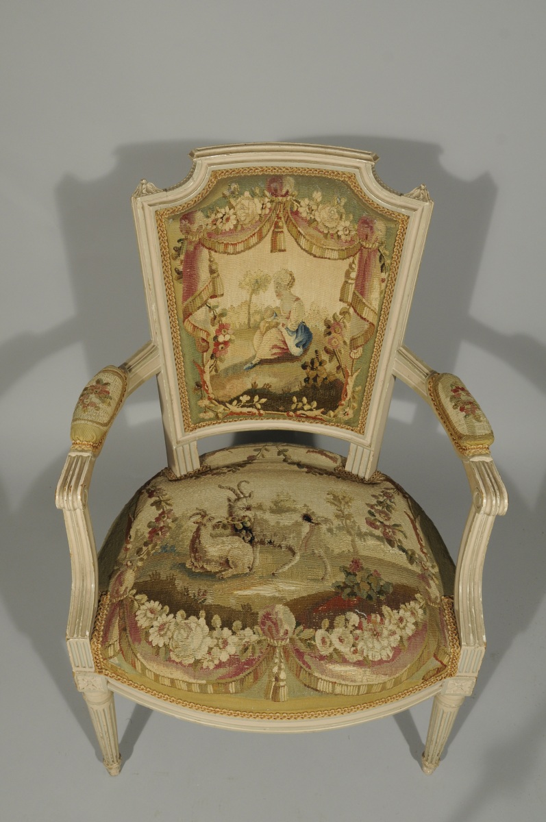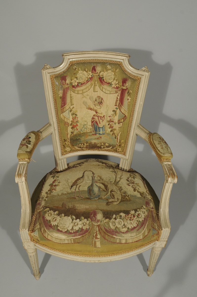 Jean de La Fontaine (1621-1695) s'inspire de l'auteur antique Ésope pour livrer, au tournant du XVIIème siècle, l'un des chefs d'uvre de la littérature française: Les Fables. Moraliste et poète, La Fontaine reste à l'écart de la vie de la Cour, mais fréquente les salons littéraires parisiens, avant d'entrer à l'Académie française en 1684. Ses fables sont reprises par de nombreux artistes, et notamment le grand peintre animalier du XVIIIème siècle: Jean-Baptiste Oudry (1686-1755). Peintre de Louis XV, Oudry travaille pour la Manufacture de Beauvais qu'il dirige par la suite, tout comme celle des Gobelins qui fournit exclusivement le domaine royal. Oudry dessine les Fables de La Fontaine entre 1729 et 1734. Une suite de ces dessins est convertie en cartons de tapisseries, et tissée seulement seize fois, entre 1736 et 1777. Après la mort d'Oudry, les dessins sont gravés en quatre volumes sous la direction de Cochin. La Manufacture d'Aubusson s'empare alors du thème, qu'elle diversifie, pour créer, à son tour, les merveilleuses assises de ces sièges, parangons de l'Art de Vivre à la Française.