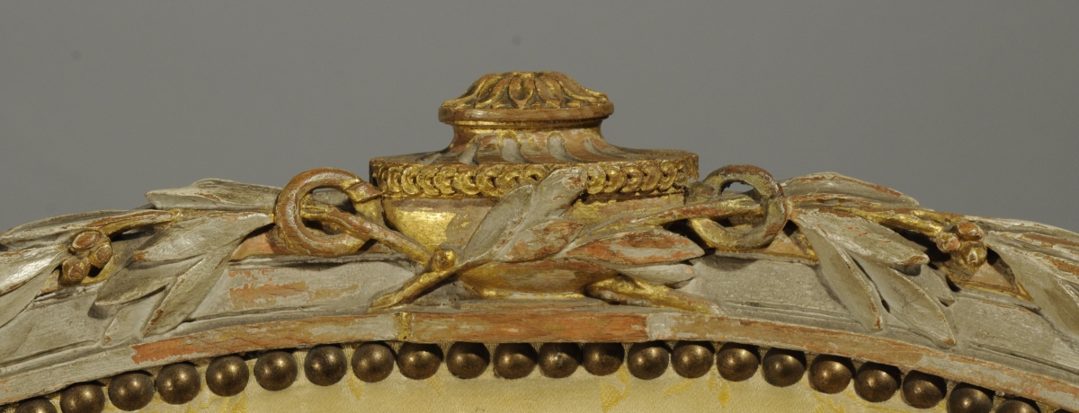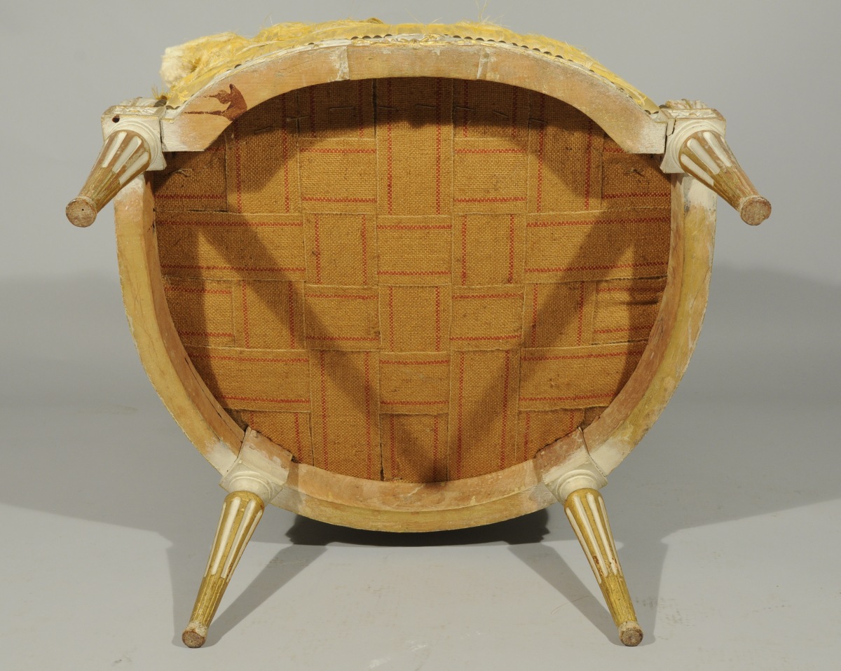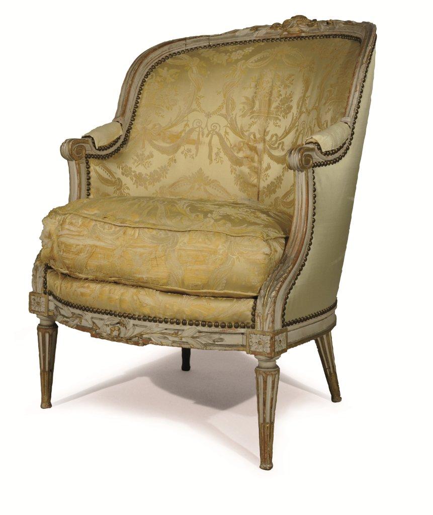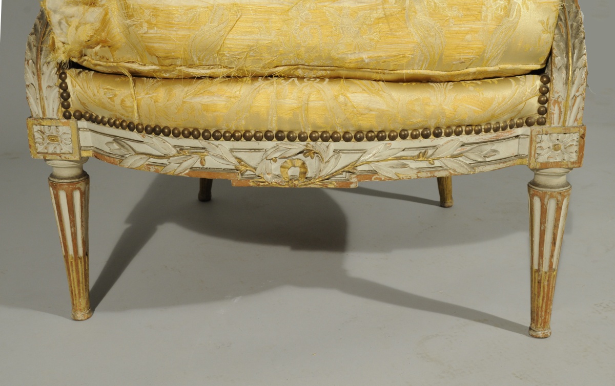 BERGÈRE en hêtre mouluré, sculpté, doré et laqué gris. Dossier enveloppant, traverse haute à décor d'une urne et de feuillages. Accotoirs cannelés se terminant en volutes. Consoles d'accotoirs cannelées et ornées de feuilles d'acanthe. Dés de raccordement ornés de fleurons. Traverse basse à décor de nœuds et feuillages. Pieds fuselés, cannelés et rudentés.