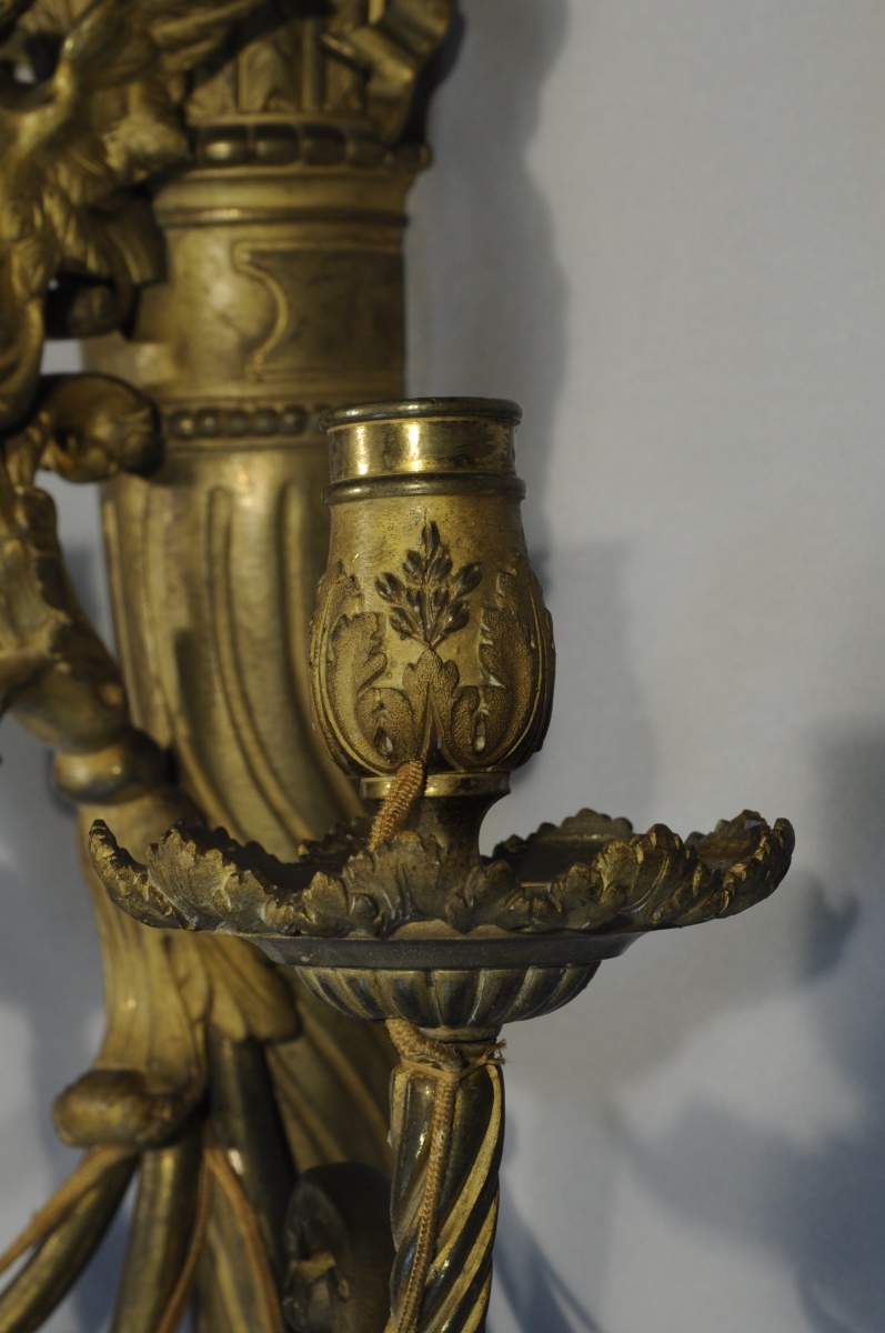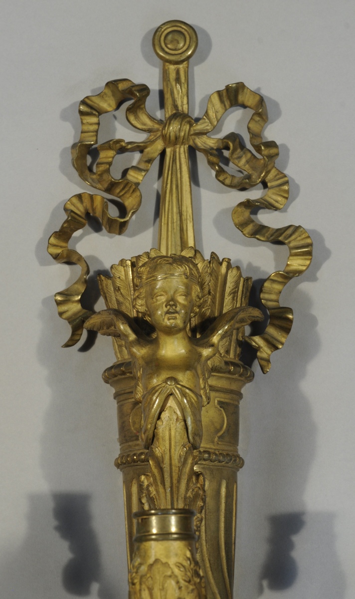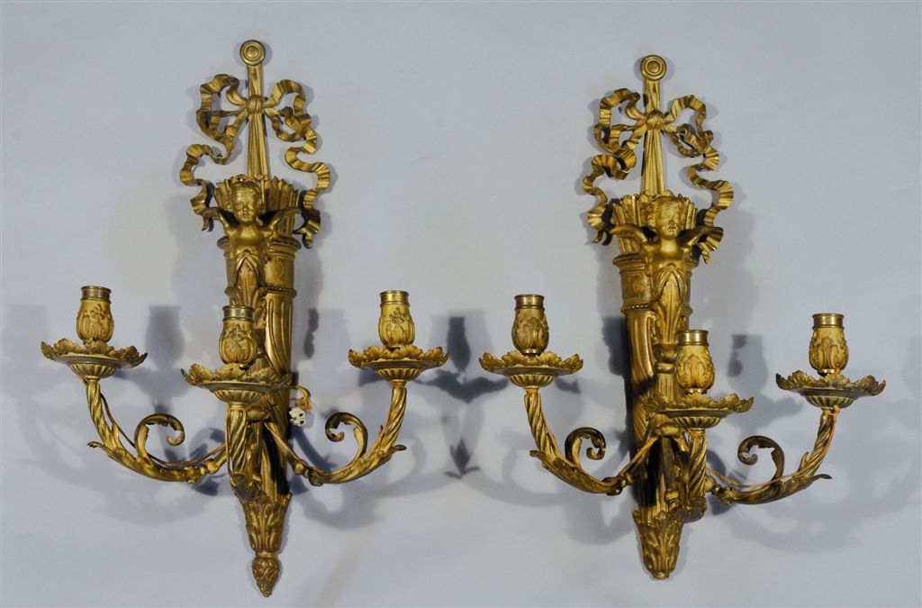 PAIRE de grandes APPLIQUES à trois lumières en bronze ciselé et doré. Fût figurant un carquois orné de cannelures ondoyantes, feuilles d'acanthe et terminé par une graine. Un angelot phytomorphe appliqué au carquois donne naissance aux bras de lumière. Ceux-ci sont agrémentés de feuilles d'acanthe et de godrons rayonnants. Bobèches et binets ciselés de feuillages stylisés. L'ensemble est sommé d'un noeud rubané.