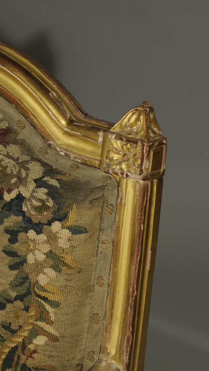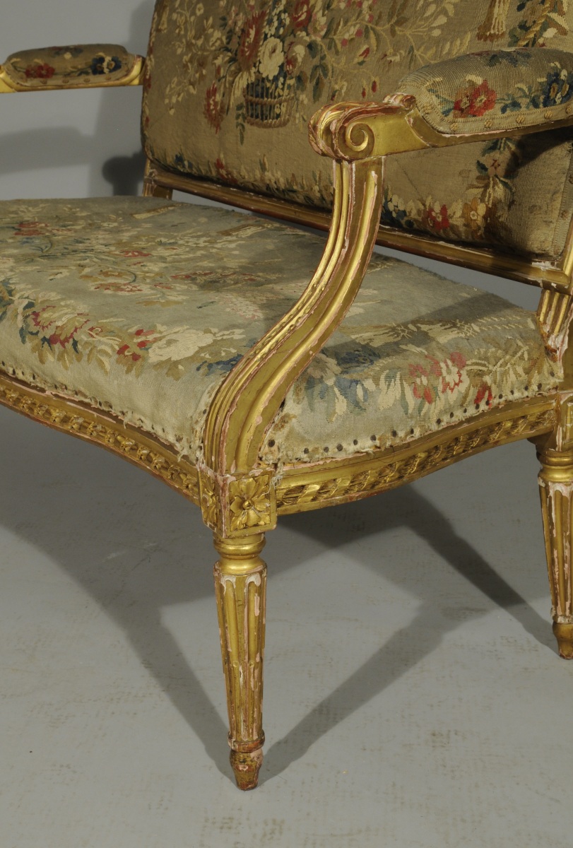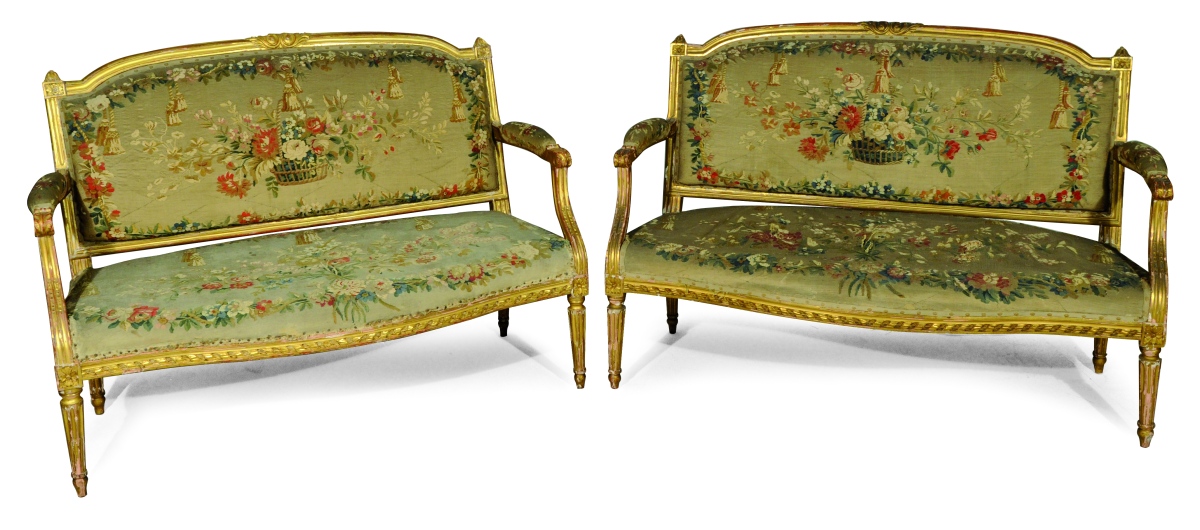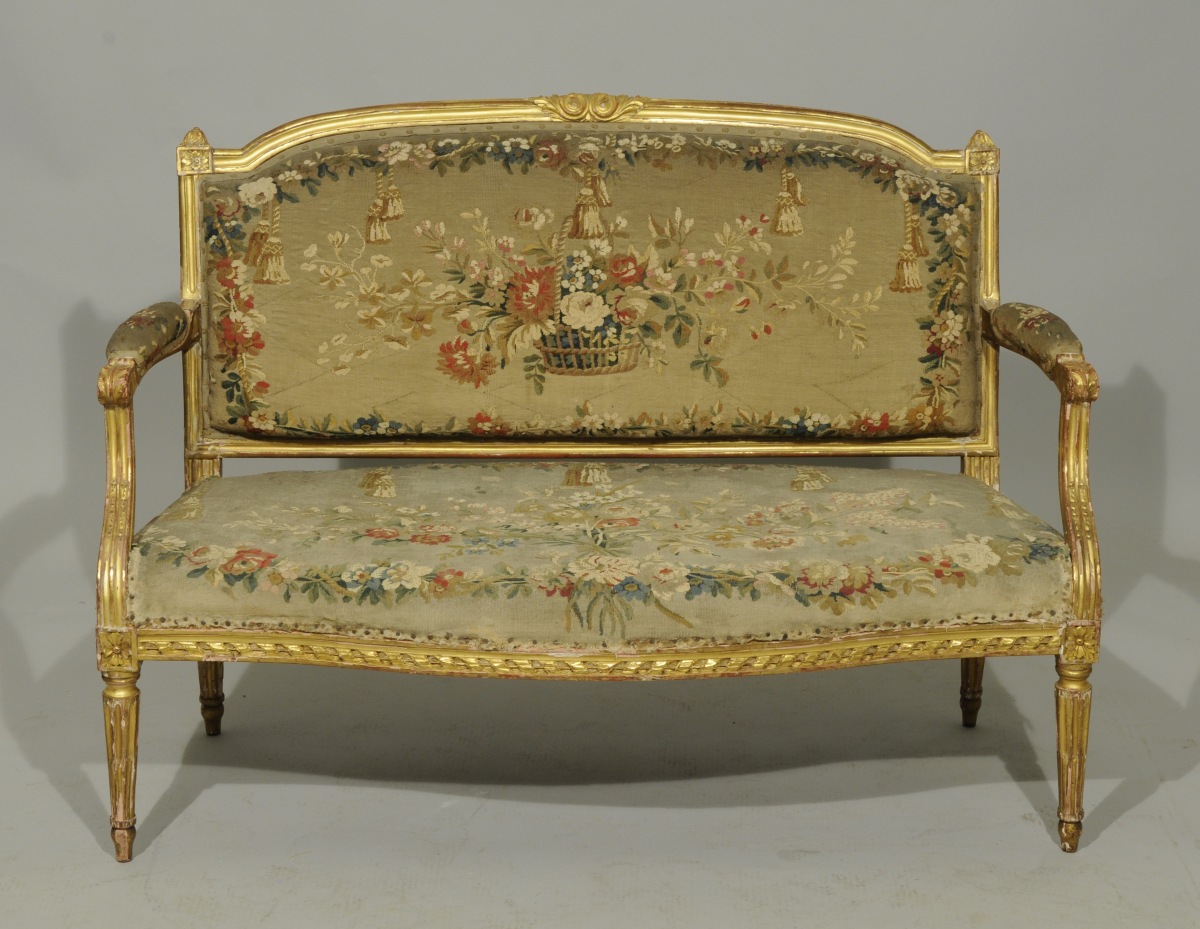 PAIRE de CANAPÉS en bois mouluré, sculpté et doré. Dossier cintré, feuilles d'acanthe à l'amortissement des montants. Accotoirs se terminant en volutes et reposant sur des consoles galbées. Dés de raccordement sculptés de fleurons. Pieds fuselés et cannelés. Dossier sculpté de feuillages. Garniture de tapisserie aux glands, paniers, guirlandes et bouquets fleuris