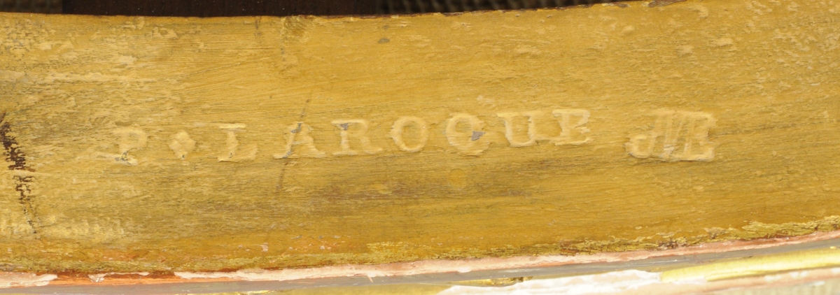 "Pierre Laroque, mesuisier parisien débuta comme artisan libre, avant d'obtenir ses lettres de maîtrise, le 11 juin 1766. Établi rue Saint-Nicolas, il fabrique des sièges jusqu'à la Révolution. En 1782, les syndics de la communauté des peintres sculpteurs saisirent une ottomane et plusieurs fauteuils qu'il avait fait orner par des ouvriers non qualifiés. On connaît d'élégants ouvrages signés de sa marque, principalement dans le style transitoire Louis XV à Louis XVI."