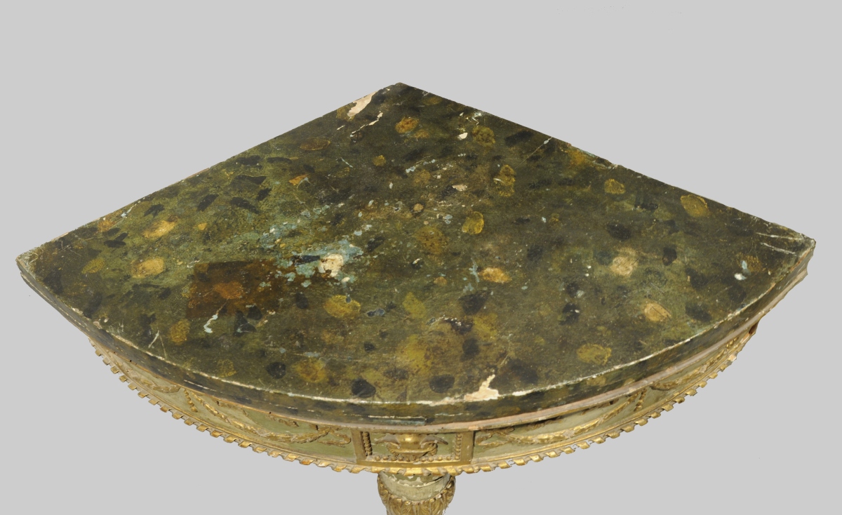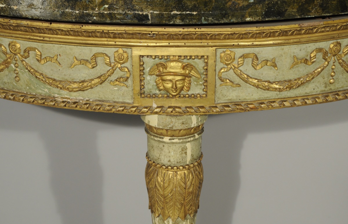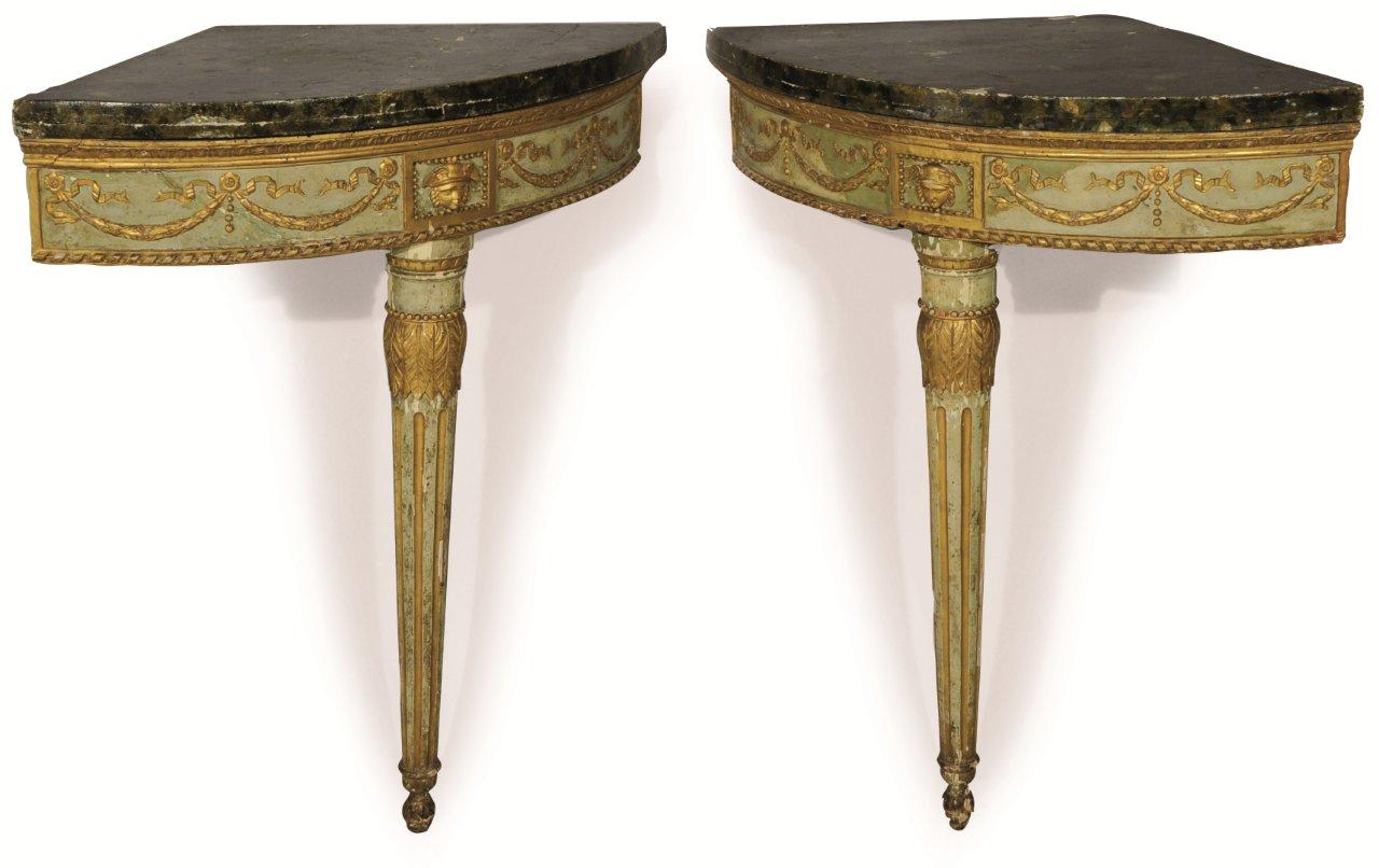 PAIRE de CONSOLES D'ENCOIGNURE en bois doré et laqué vert. Décor mouluré et sculpté de guirlandes feuillagées retenues par des fleurettes, nouées de perles, de rubans, et de frises de feuilles d'eau. Faux dés de raccordement ornés du visage de Mercure, casqués dans un encadrement de perles. Pieds fuselés et cannelés à décor de frises de feuilles d'eau et de perles se terminant en graine. Dessus de bois peint à l'imitation du marbre vert.