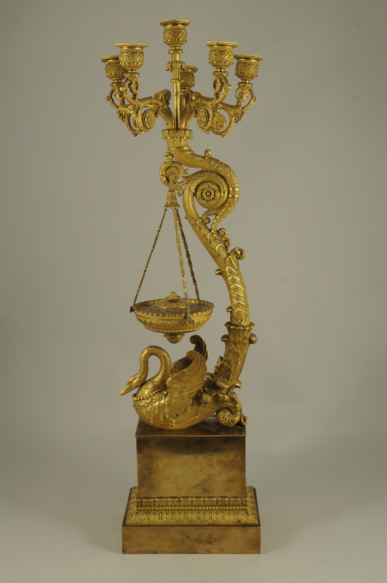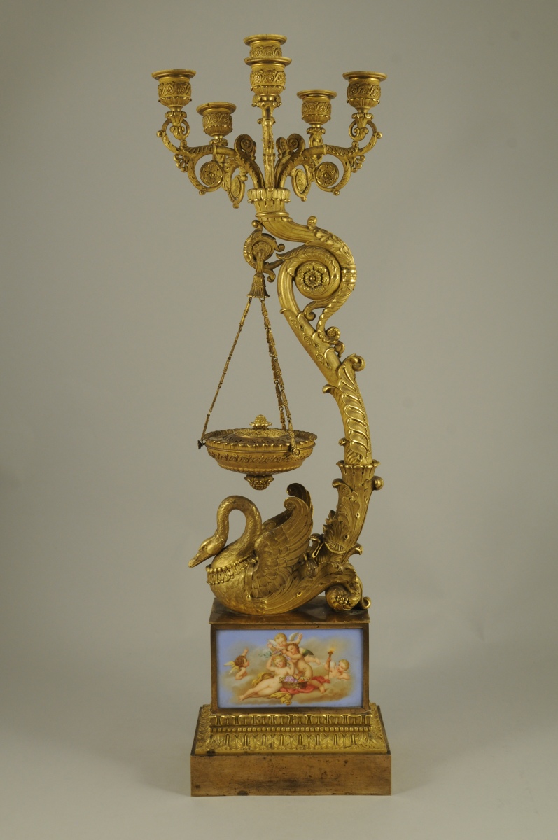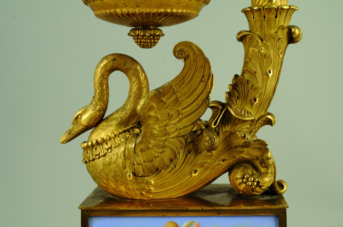Rare PAIRE de CANDÉLABRES BRÛLE-PARFUMS AUX CYGNES en bronze ciselé et doré, à plaques de porcelaine.