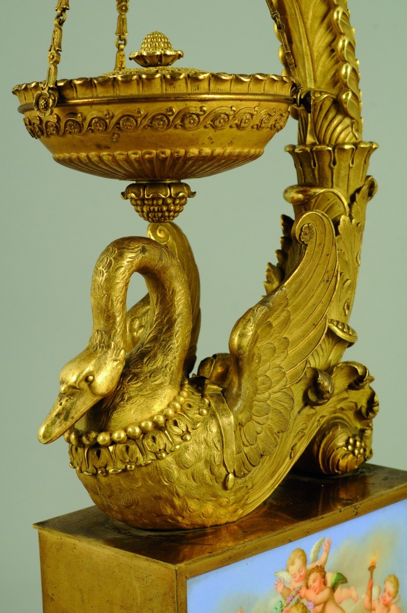 Deux cygnes de bronze, aux ailes déployées, le cou orné d'un ruban et d'un collier de perles sont affrontés, en pendant, sur chaque socle. Leurs queues sont à l'amorce d'une palme richement ciselée de feuillages et de fleurs. Les palmes se terminent en enroulement, soutenant chacune un brûle-parfum suspendu par trois chaînettes. Couvercle à palmes ajourées, fretel et cul de lampe en pomme de pin, navette de godrons.