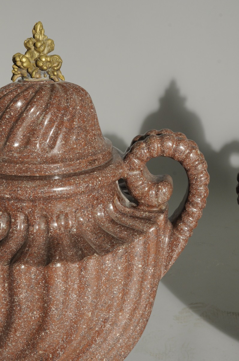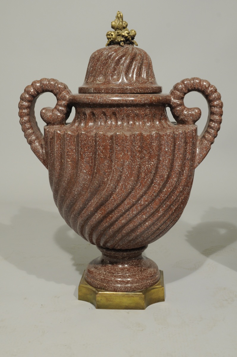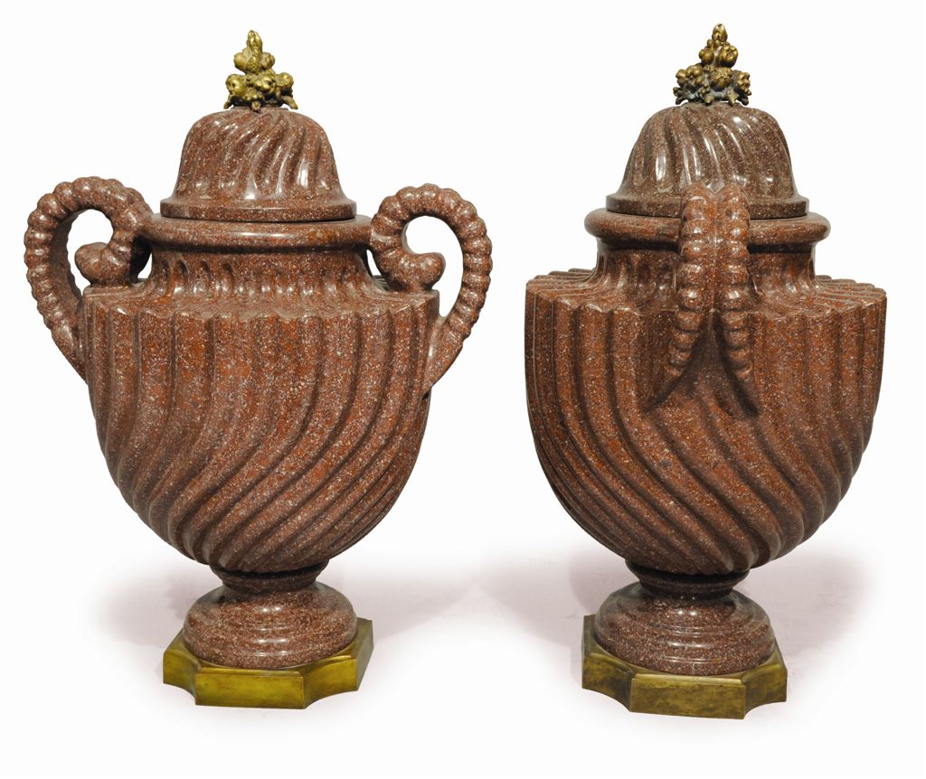 Paire de VASES COUVERTS en porphyre rouge, ou en quartzite, à côtés torses inversées, en forme d'urne à panse et col à décor de godrons creux spiralés à anses doubles annelées terminées en pinces de homard et reposant sur des bases à piédouche. Couvercles à godrons creux spiralés à côtes inversées. Socles quadrangulaire à pans évidés montés en bronze doré et boutons en fruits éclatés.