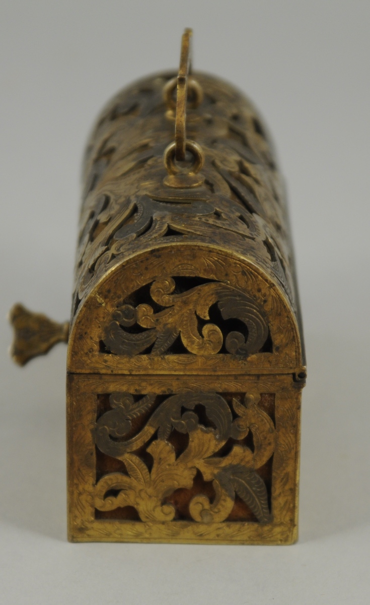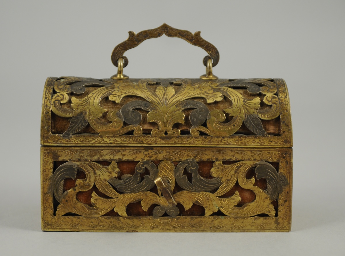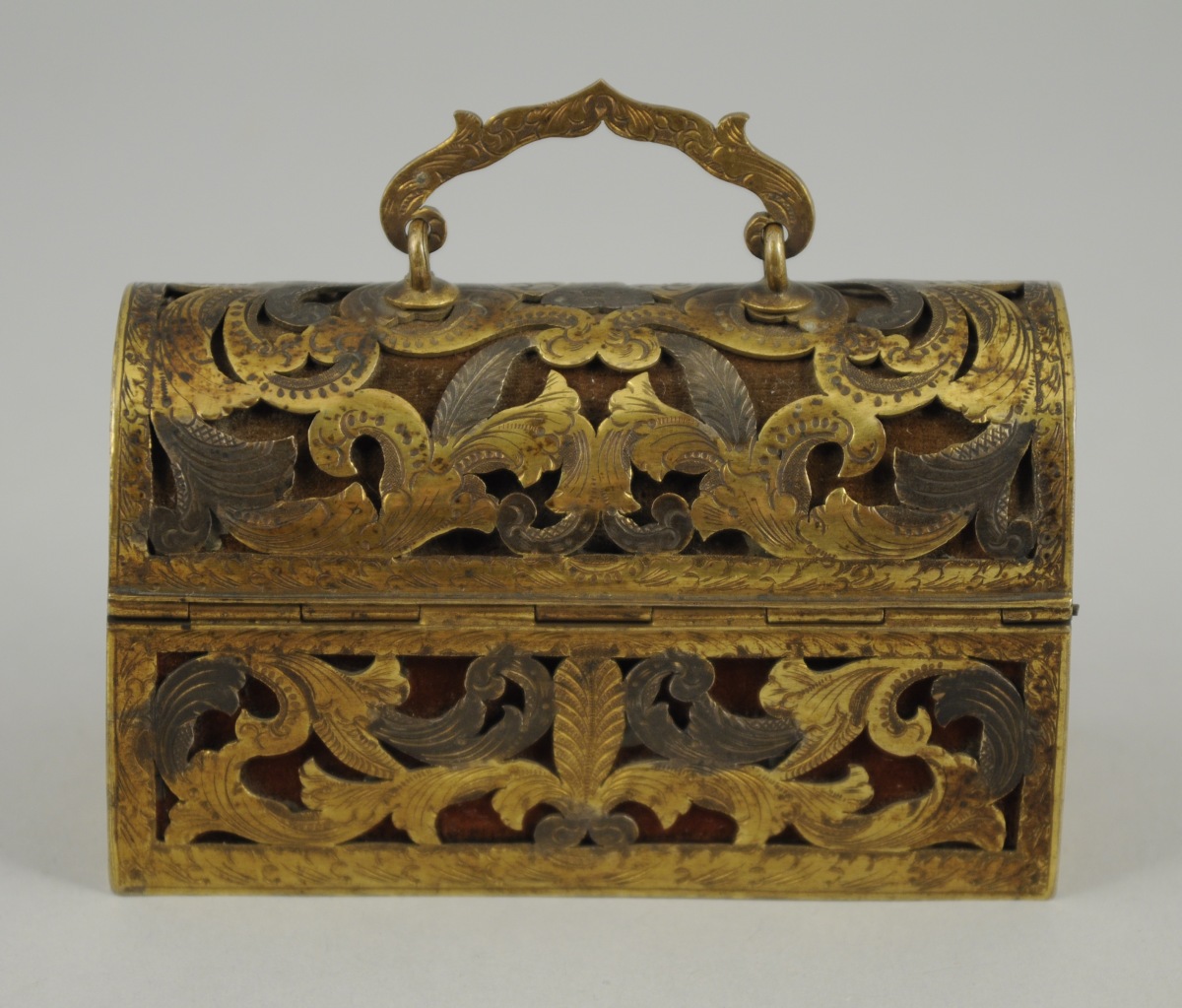 COFFRET en bronze doré et argenté ajouré de rinceaux. Couvercle bombé sommé d'une poignée formée de rinceaux. Intérieur tapissé de velours fauve. Avec sa clé.