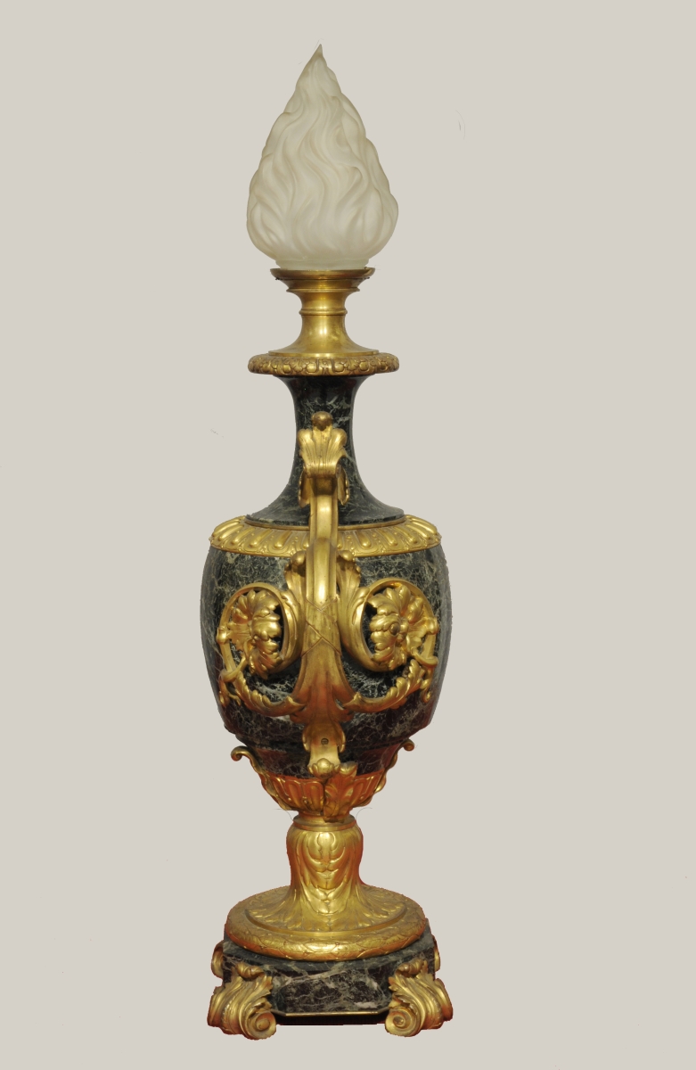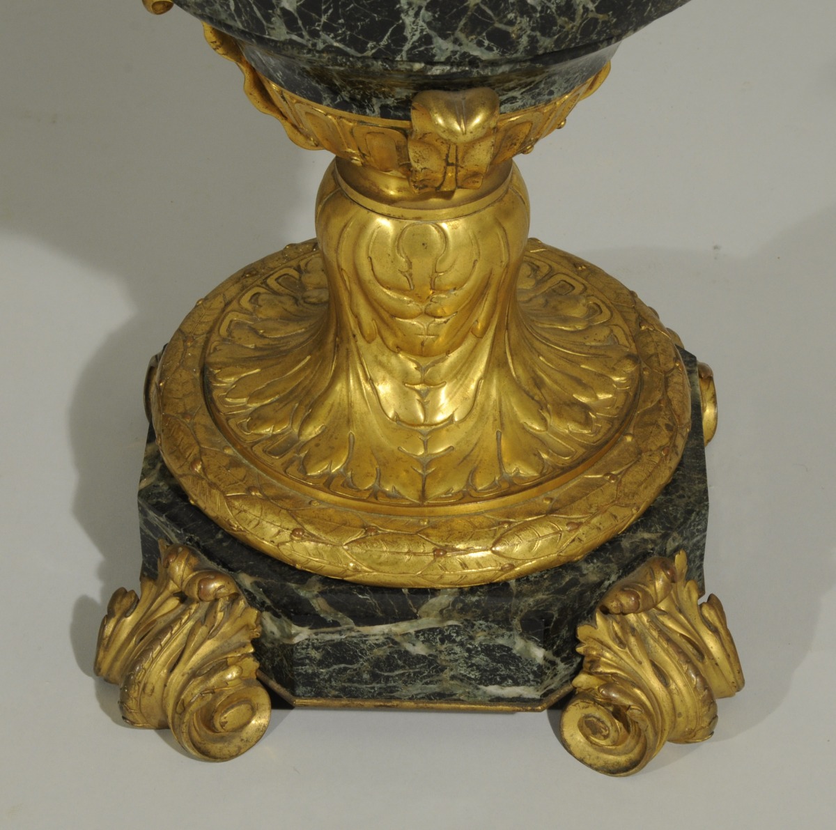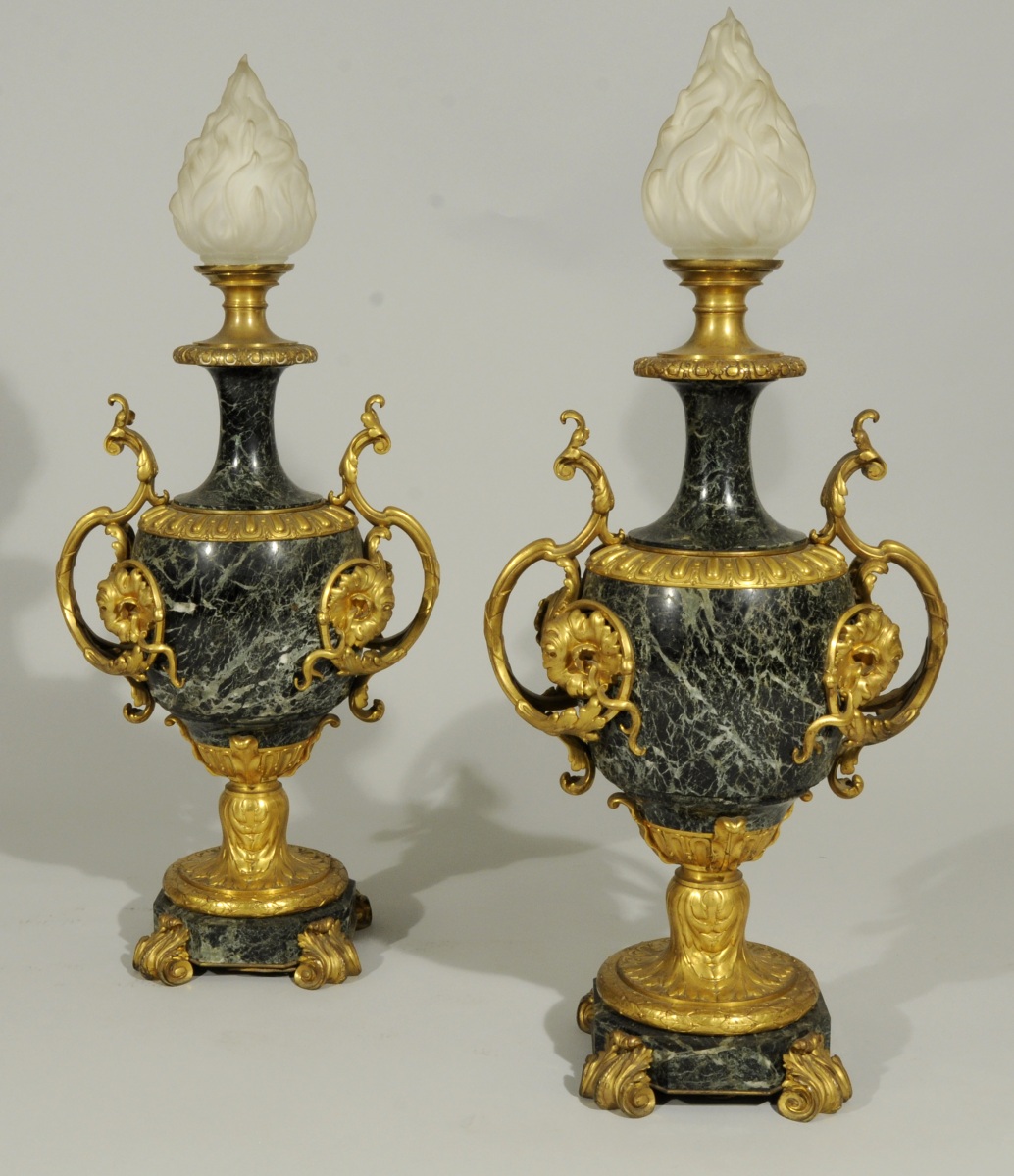 PAIRE de VASES montés en lampes en marbre vert et bronze doré. Col à décor de feuille d'acanthe et entrelacs, épaule alternée de godrons, entrelacs et feuillages, anses formées de fleurs et rinceaux rubanés, pieds ornés de godrons, feuilles d'acanthe et tore de laurier, socle octogonal se terminant par quatre volutes feuillagées. Verres en forme de flamme, montés à l'électricité.