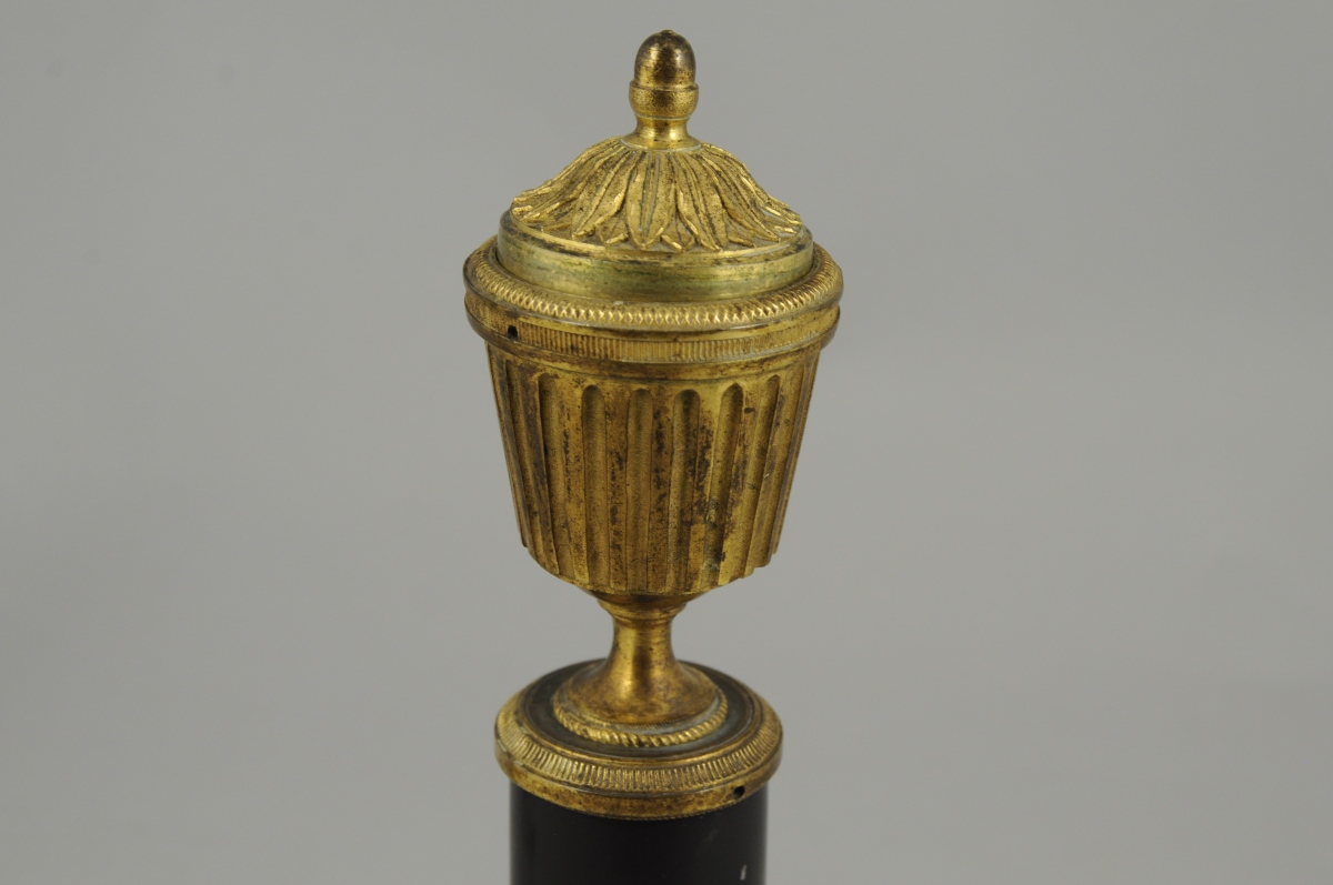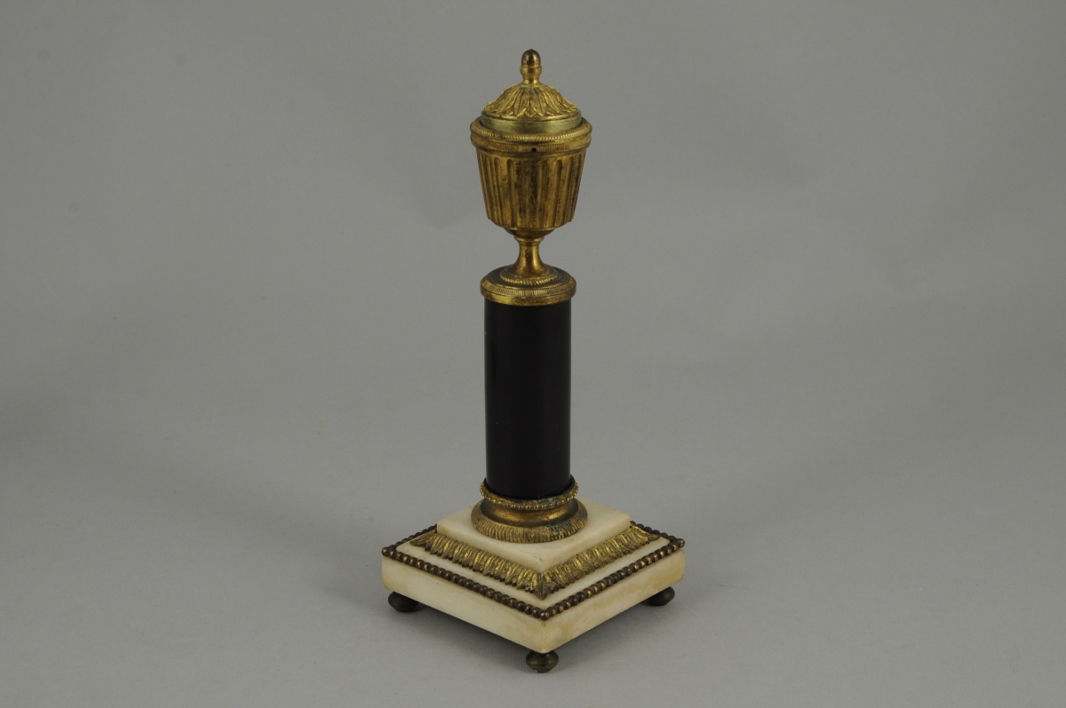 PAIRE de BOUGEOIRS formant cassolettes, en bronze doré et ciselé à décor de feuilles d'eau, cannelures, frises de croisillons et torsades. Couvercle réversible. Fût en colonne laqué noir reposant sur une base carrée en marbre blanc ornée de frises de feuilles d'eau et de perles en bronze doré. Pieds boules en bronze.