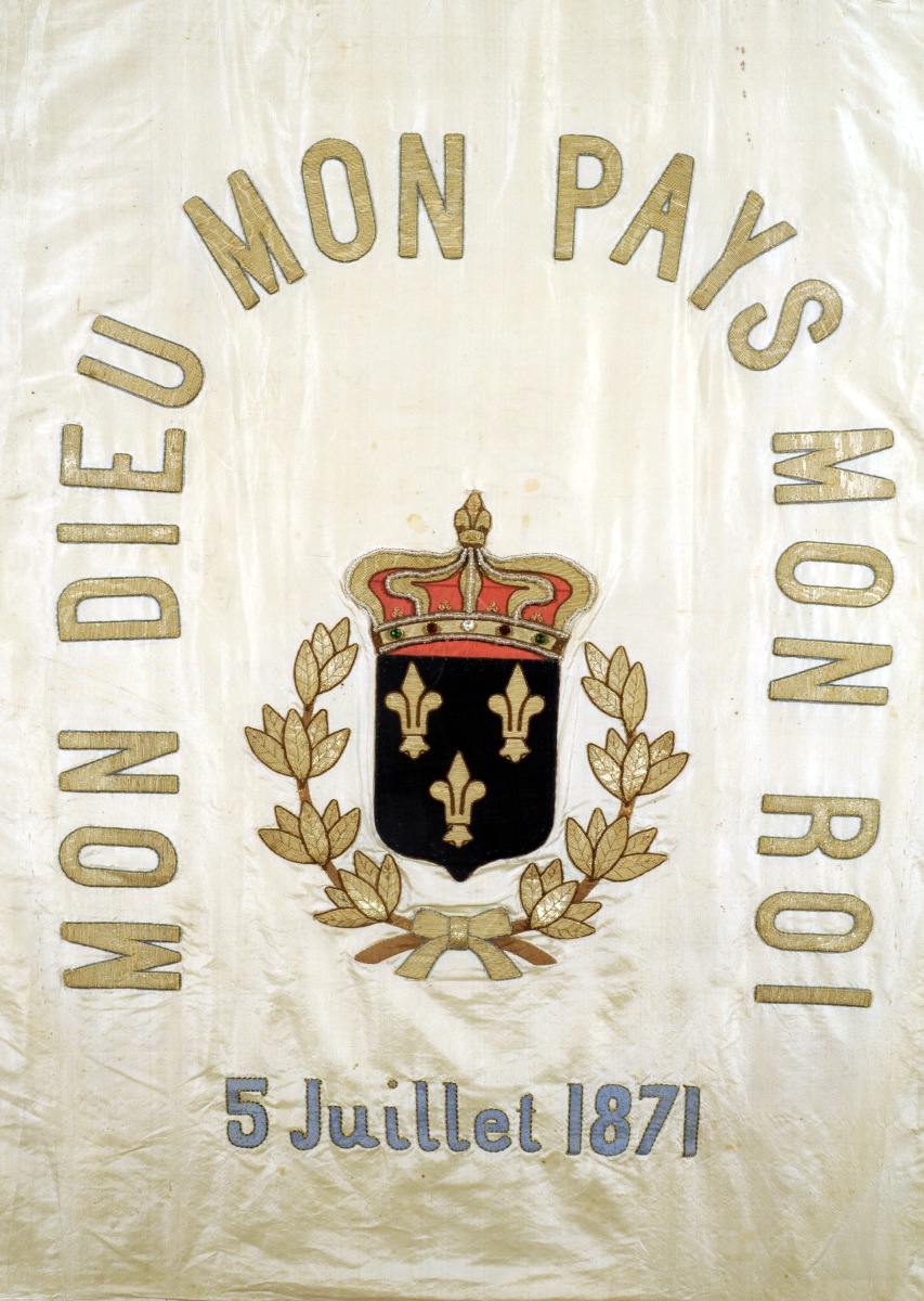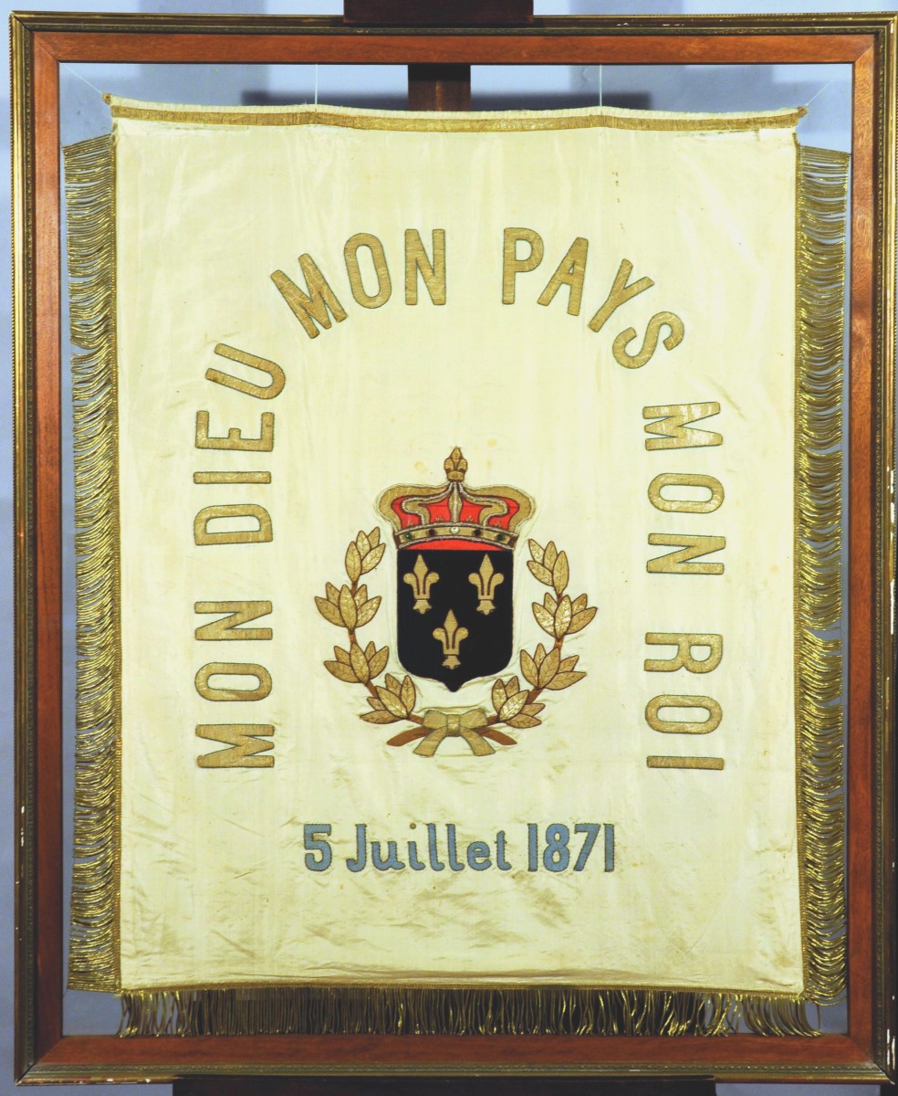 ÉTENDARD AU MANIFESTE DU COMTE DE CHAMBORD en soie blanche brodée. Le recto reçoit les armes de France timbrées de la couronne royale et encadrées de branches de laurier. Il arbore la devise