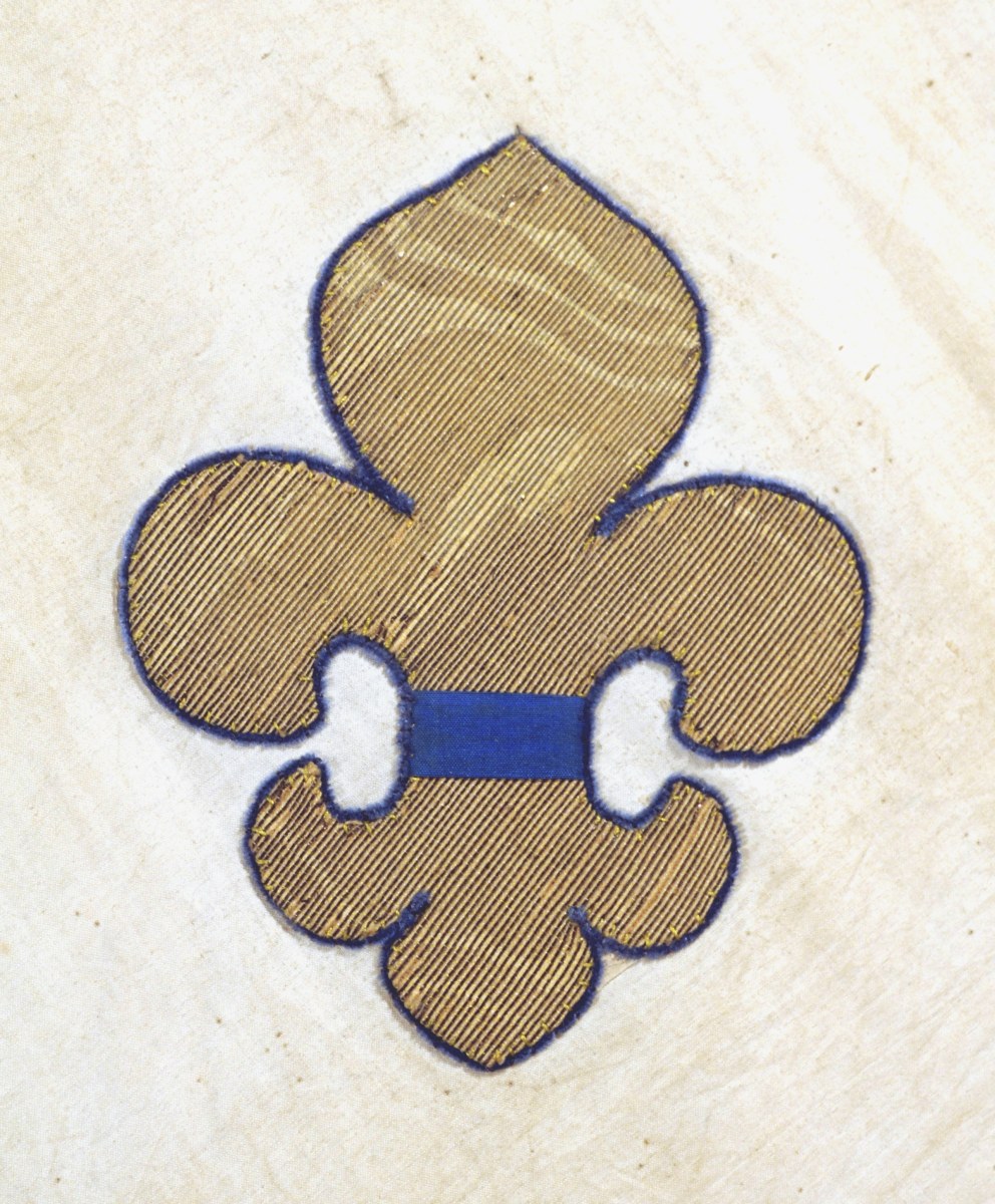 drap bleu renfermant le Sacré-Coeur transpercé d'une flèche. Aux quatre coins figure une fleur de lys d'or.