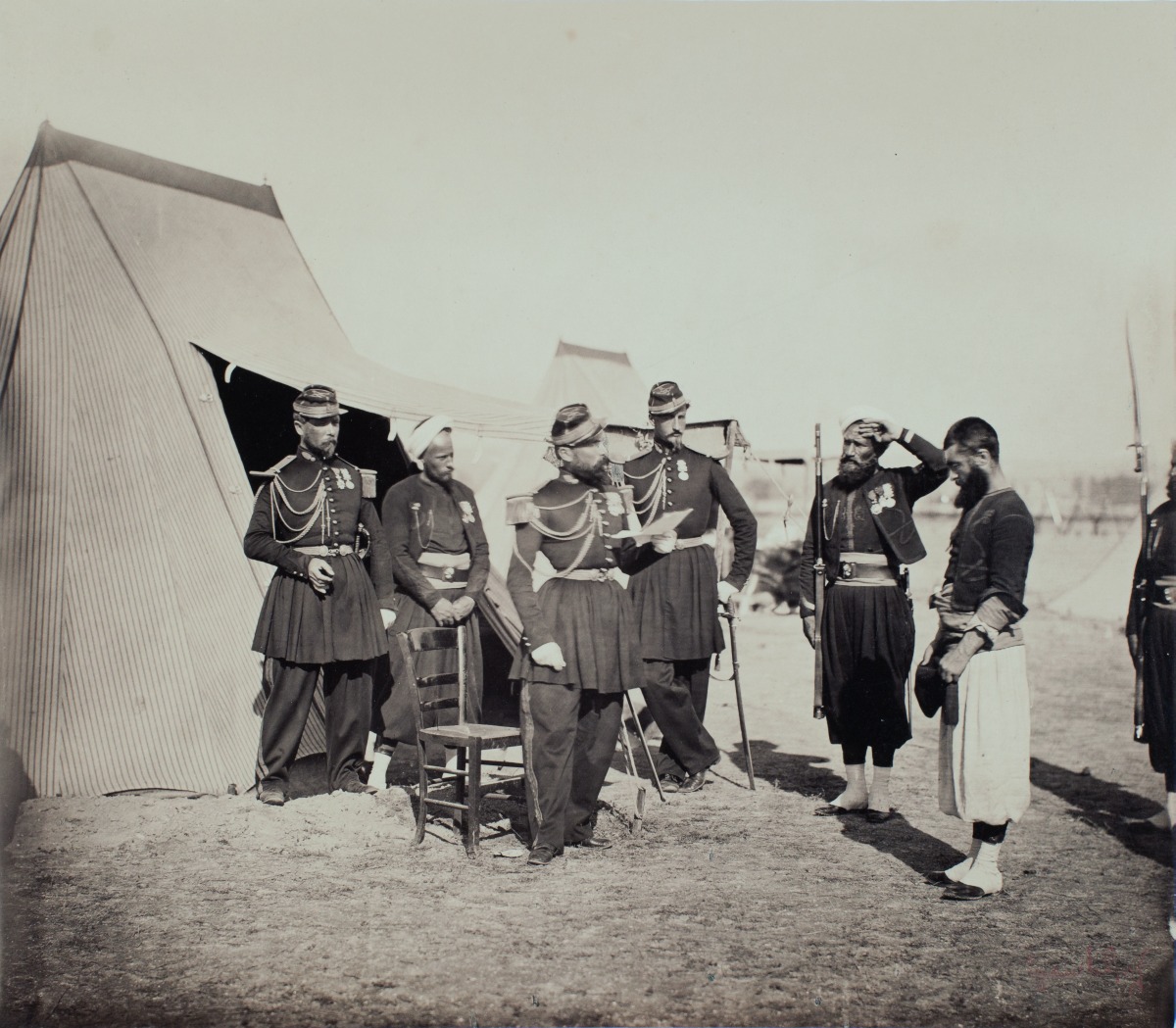 "La mise en scène théâtrale est caractéristique de la photographie du Second Empire: le personnage important est au centre, devant une chaise ; les trois officiers sont placés en triangle, leurs uniformes et leurs décorations bien visibles. Un zouave salue "à l'ancienne manière", une main posée à plat sur le front, tandis que le délinquant se présente devant ses camarades en petite