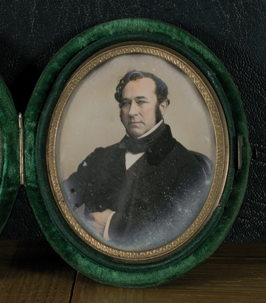 Daguerréotype ovale délicatement aquarellé, dans son écrin de velours vert d'époque.