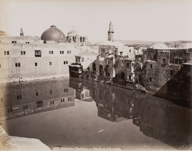 Palestine, 53 épreuves par Bonfils: vues de Jaffa, Bethléem, Jérusalem. Panorama de Jérusalem pris du Nord (en 2 épreuves), caravane ou palanquin de voyage,