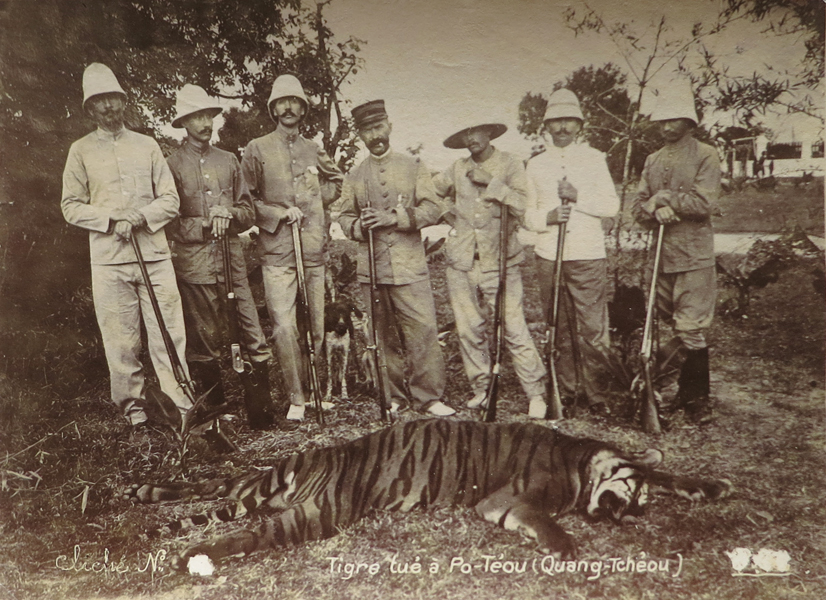 Dignitaires chinois et européens, marchandes de bière, costumes traditionnels et attributs, femme à l'ombrelle, tigre tué à Po-Téou (Quang Tchéou).