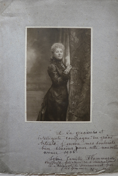 Bel envoi autographe à l'encre sur le carton de montage de Mme Flammarion à Mme Taponier "A la gracieuse et intelligente compagne du grand Artiste, j'envoie mes souhaits bien sincères pour cette nouvelle année 1906. Sylvie Camille Flammarion, présidente fondatrice de l'Association La Paix et le Désarmement par les femmes, 26 j. 1906".