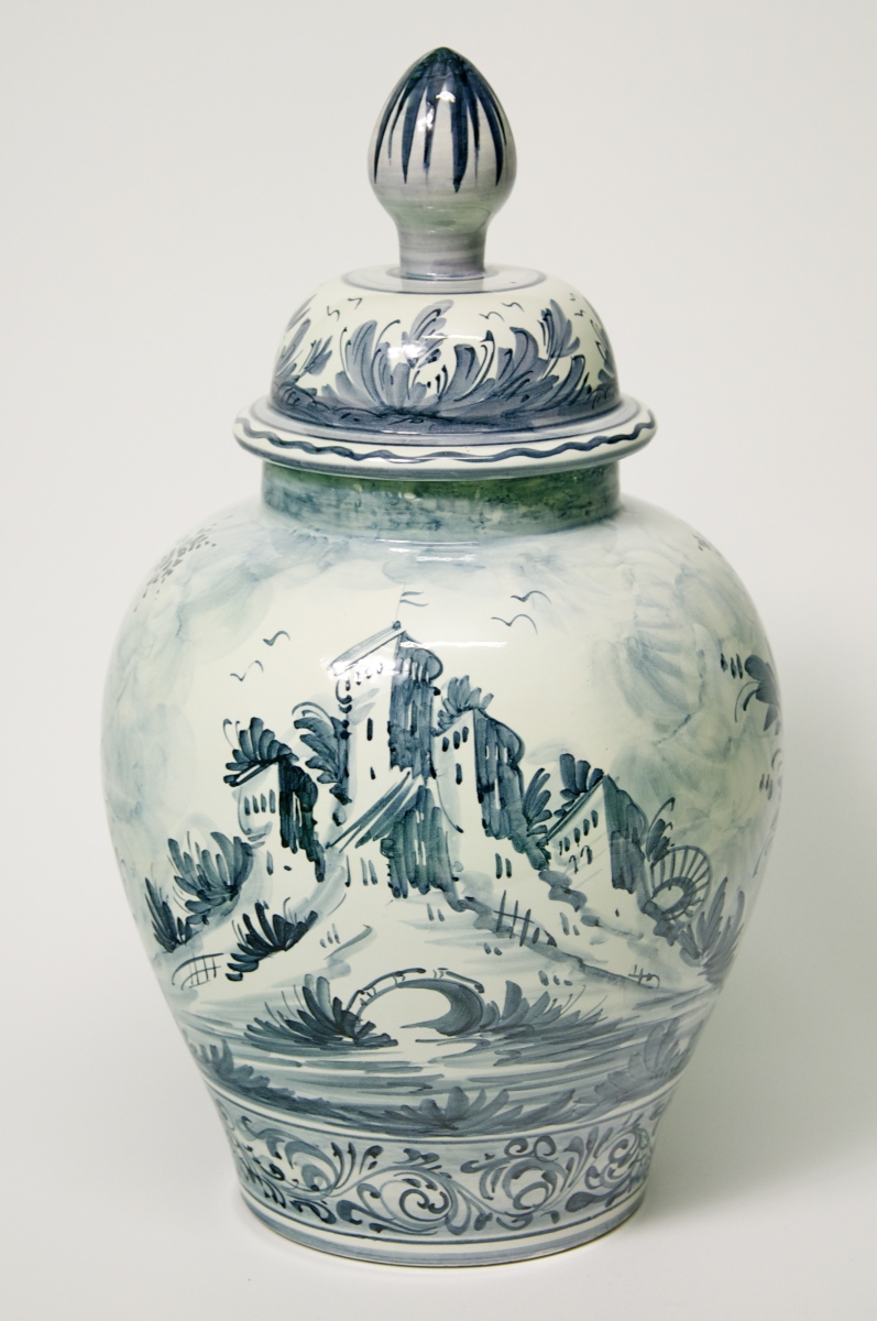 Grand POT COUVERT en faïence à décor en camaïeu de gris représentant des anges dans un paysage. Marqué sur le fond: " M Pastorino situé Albisola "