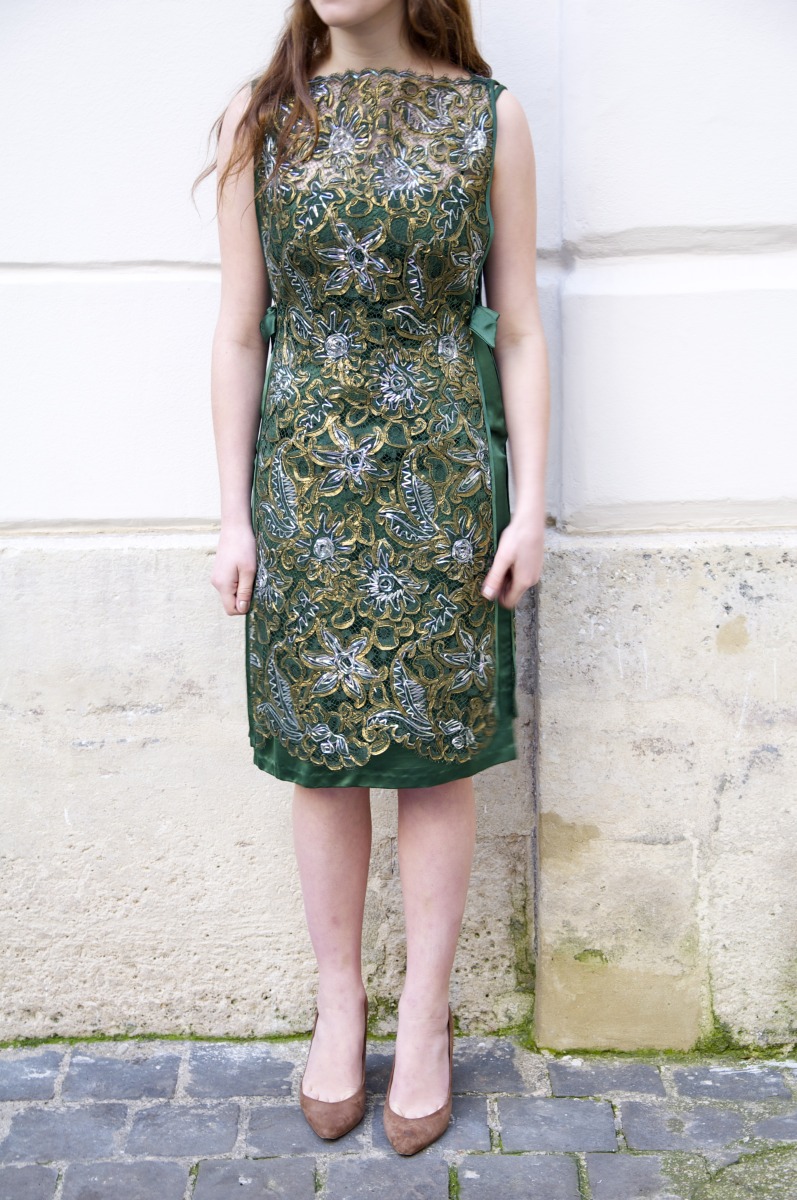 ROBE FOURREAU. Robe vintage années 60, en dentelle brodée de fils dorés et argentés, sur doublure de satin vert, à trois trous. Taille 34.