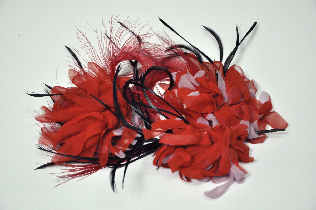 Broche en soie et plumes rouge et noir.