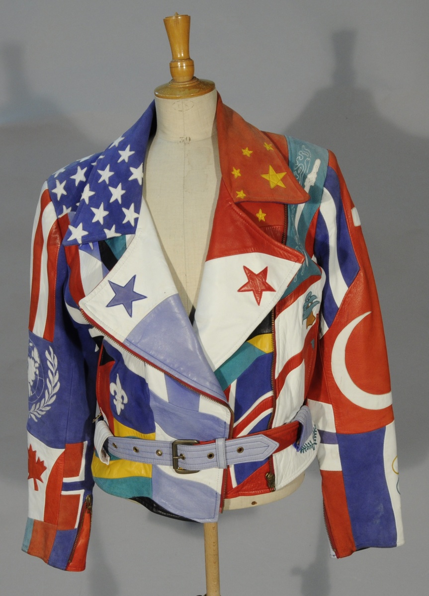 BLOUSON de cuir griffé Jean-Claude JITROIS. Patchwork de cuir aux drapeaux.