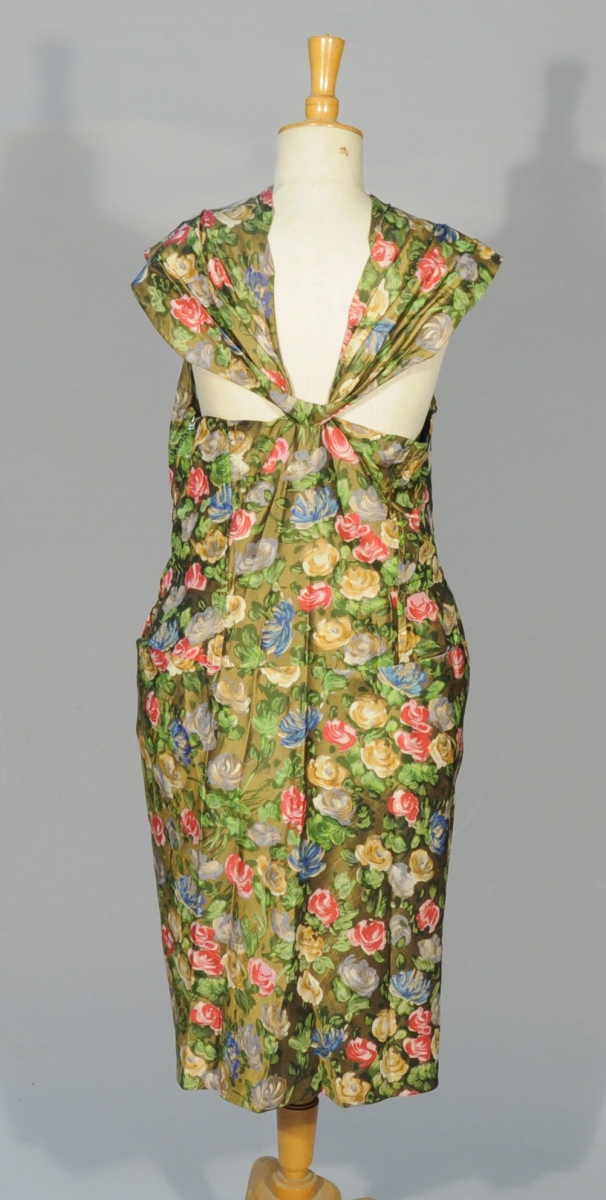 ROBE à dos nu BALENCIAGA vers 1950. Satin Robert Perrier, fond bronze imprimé polychrome de fleurs. Pour Madame Robert Perrier.