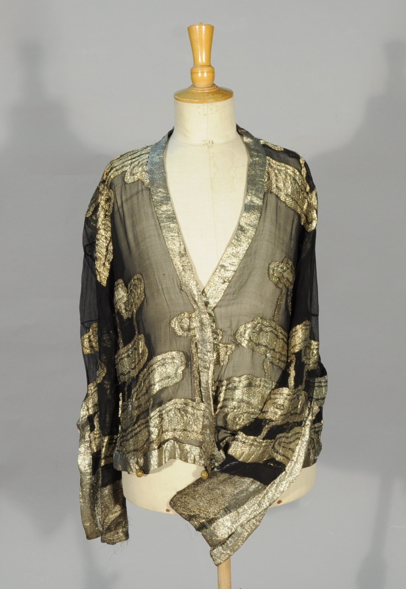 VESTE 1930 en mousseline de soie noire brochée or à décor japonisant. Pour Madame Georges Perrier à Lyon.