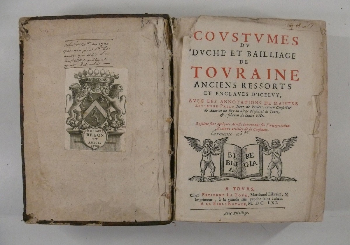 TOURAINE - Estienne PALLU. Coustumes du duché et bailliage de Touraine, anciens ressorts et enclaves d'iceluy, avec les annotations de Maistre Estienne Pallu, sieur de Périers, ancien conseiller & advocat du Roy au siège présidial de Tours. Tours, Estienne La Tour, 1661.