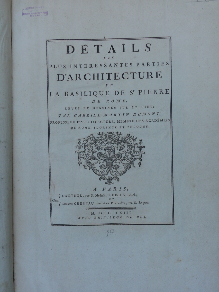 DUMONT (Gabriel-Martin). Détails des plus intéressantes parties d'architecture de la basilique de St. Pierre de Rome, levés et dessinés sur le lieu par Gabriel-Martin DUMONT, professeur d'architecture, membre des académies de Rome, Florence et Bologne. Paris, Chez l'auteur et Madame Chéreau, 1763.