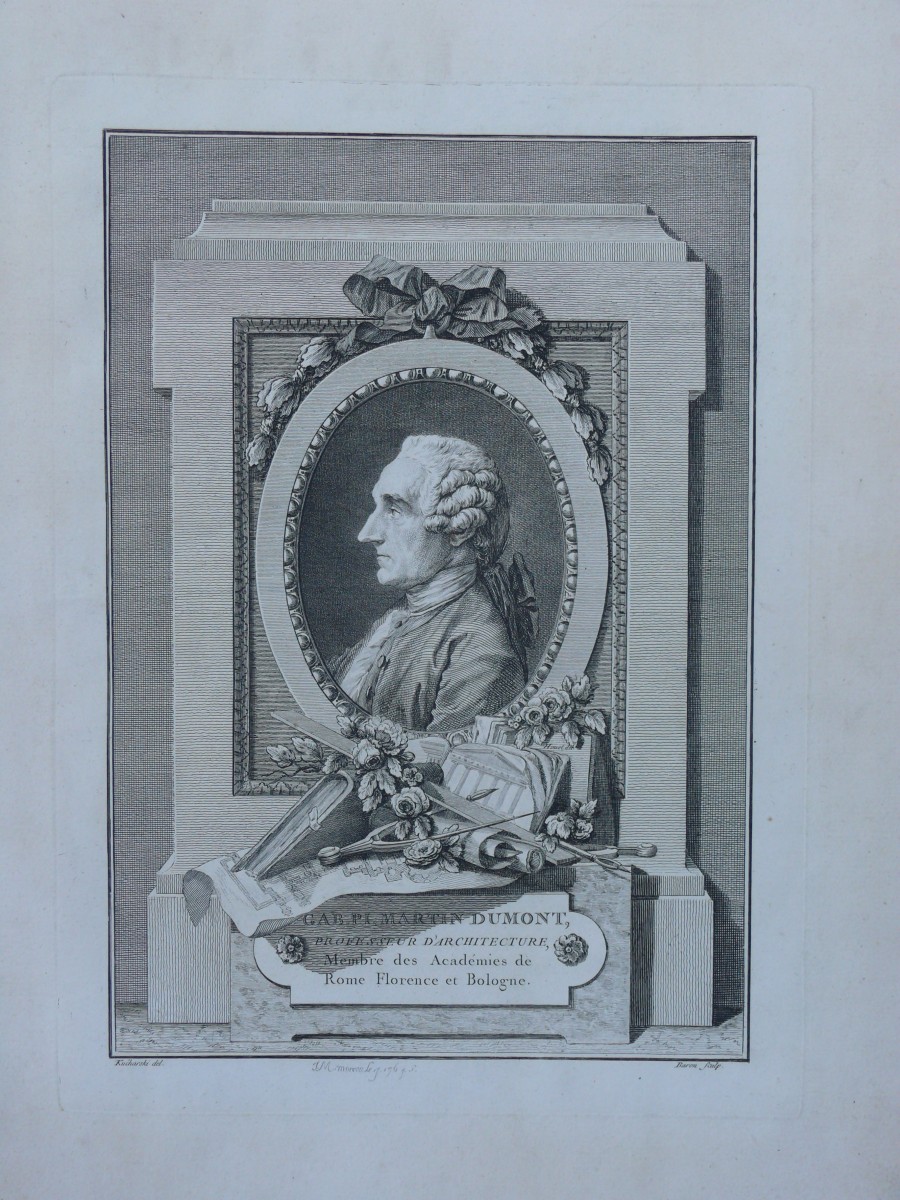 In-folio, 1/2 veau ép. dos à nerfs orné (rel. défraîchie). Portrait de Dumont en front., vignette dédicace par Choffard, grande vignette représentant St. Pierre de Rome, 99 planches sur 100 dont 5 d'explications. Qqs. rouss. et mouillure claire angulaire sur 34 ff. cependant bel exemplaire en édition originale.