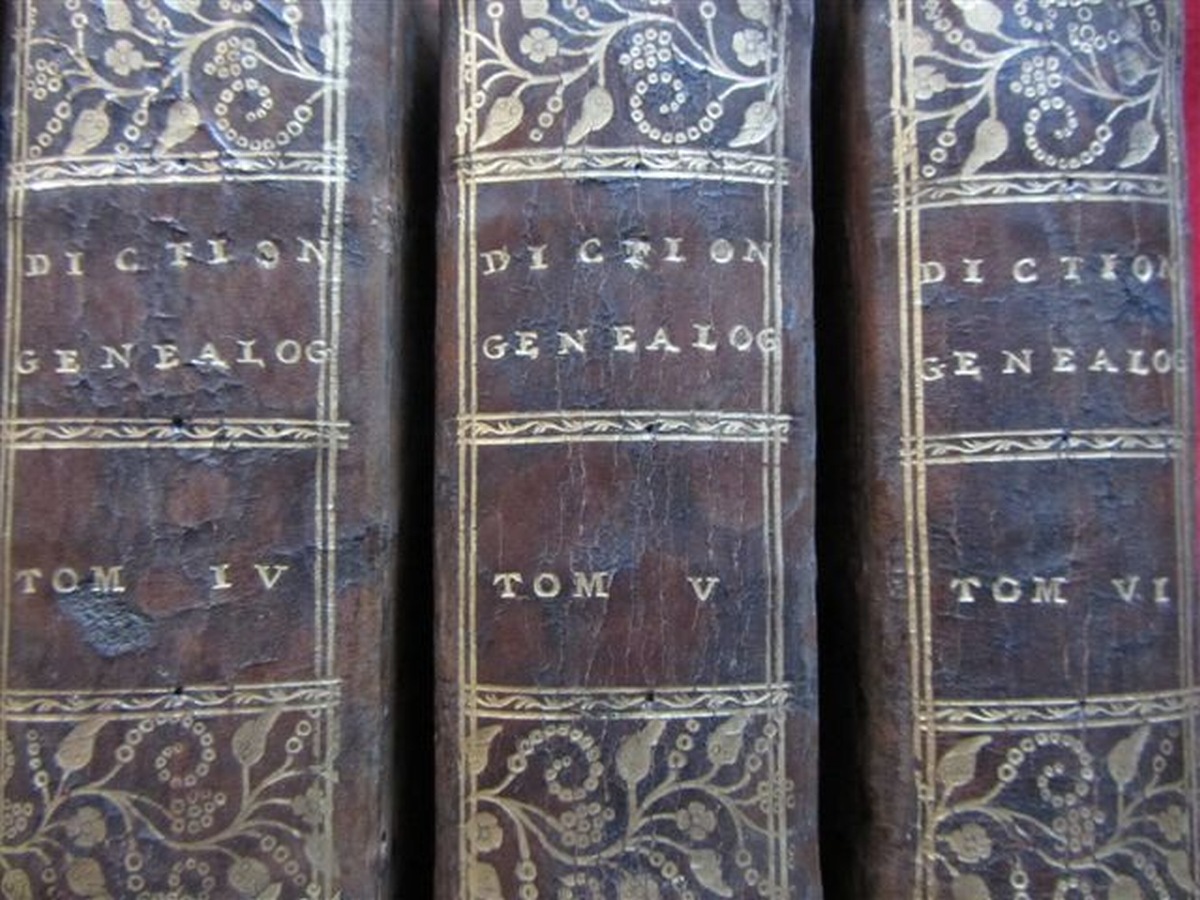 6 vol. sur 7, in-12 (manque le T.4 du supplément.). Veau ép., dos lisses ornés, plats aux armes dorées du Vicomte de Montaigne de Poncins (ex-libris du même). Première édition du Dictionnaire de la noblesse réédité sous ce titre en 1770. (Brunet, II, 608 ; Barbier, I, 974.)