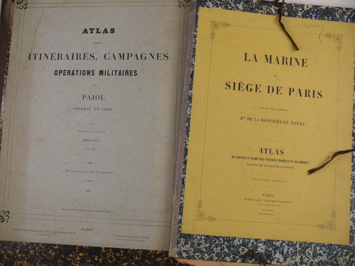 On y ajoute: Atlas des itinéraires, campagnes, opérations militaires de PAJOL, général en chef. Paris, Firmin-Didot, 1874. In-folio sous chemise imprimée. Complet des 8 cartes couleurs auxquelles sont jointes 6 autres cartes militaires de 1871.