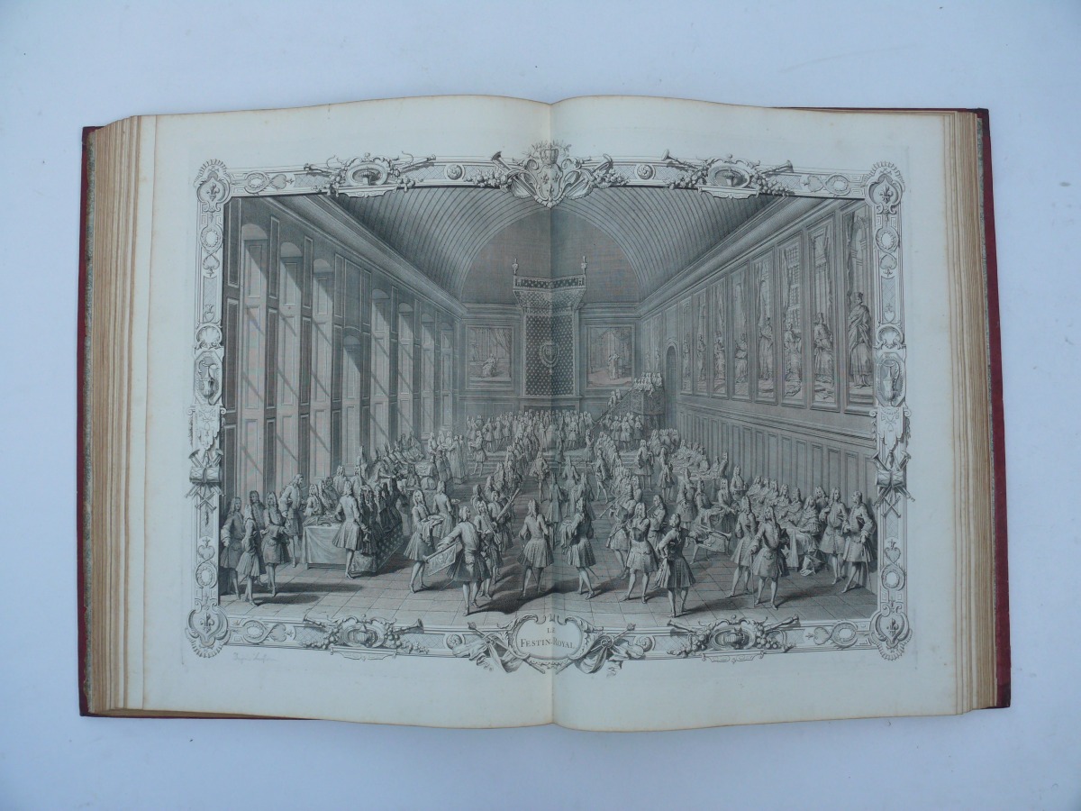In folio entièrement gravé. Titre, 2 pp. de louanges, 2 pp. d'avertissement, 9 pl. double, 28 pp. de "description historique (...)" et d'"explication des figures allégoriques", 30 pl. de costumes, index des noms des peintres et graveurs, et une pl. double pour la table du vol. Les planches sont dessinées par Ulin et Danchet et gravées par Cochin, Audran, Beauvais, Larmessin etc... (Réf. Cohen, 527).