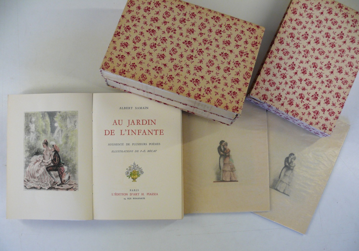 BECAT (Paul-Emile) & Albert SAMAIN. 3 volumes illustrés par Bécat: Au jardin de l'Infante - Le chariot d'or, symphonie héroïque, aux flancs du vase - Contes, Polyphème etc... Paris, Piazza, 1949 - 1950.
