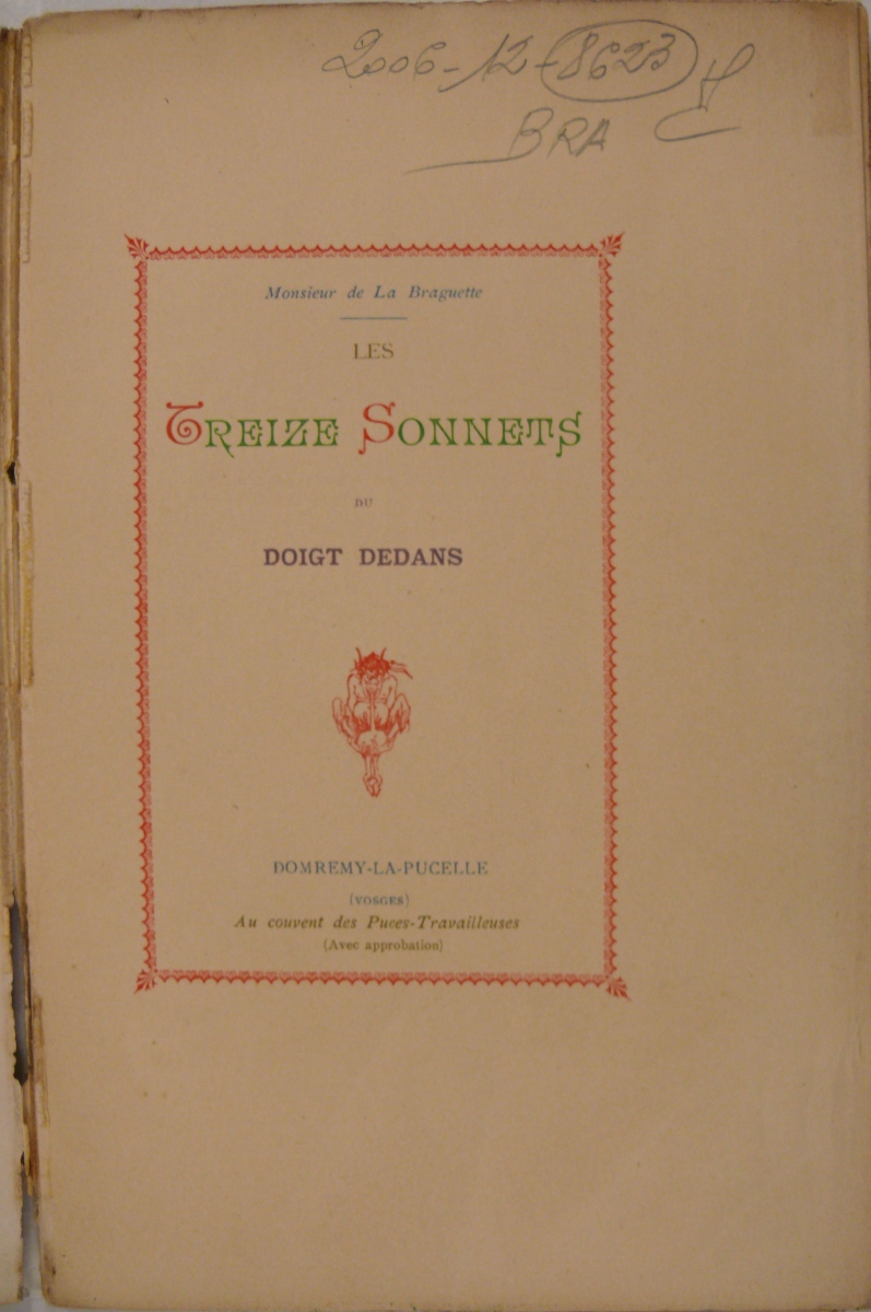 BRAGUETTE (Monsieur de LA). Les Treize sonnets du doigt dedans. Dorémy-La-Pucelle, Au couvent des Puces-Travailleuses (Avec approbation), Sans année.