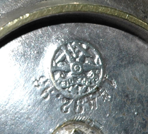 Encrier en bronze argenté, forme d'un calice sur une coupelle décor rocaille. Pour un godet encrier, sous couvercle charnière. Circa milieu XIXème.