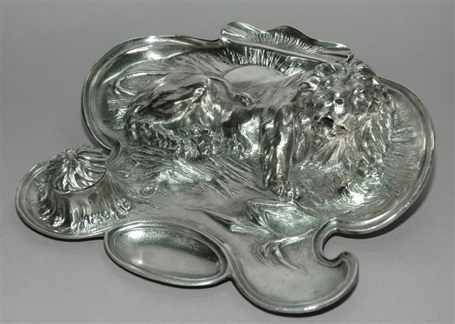 Écritoire Art Nouveau forme plateau avec réceptacles plumiers pour un décor animalier d'un lion couché. La tête dissimule un premier encrier, un second encrier se trouve dans le tronc d'arbre. Signature du sculpteur: ADT. NEUENS, Circa 1900. (30cm, 26cm)
