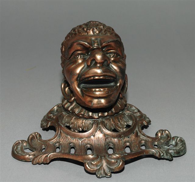 Encrier à patine cuivrée figuratif d'une tête d'un noir hilare qui à l'ouverture de la partie supérieure du crâne révèle le godet encrier en porcelaine.