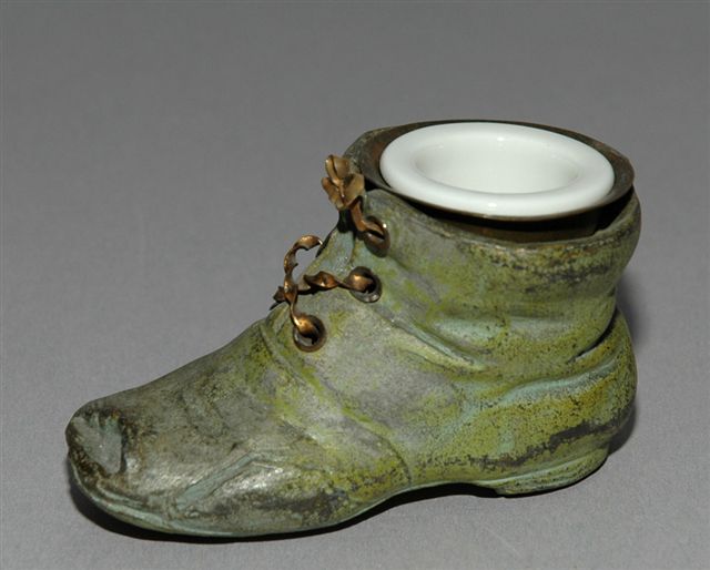 Encrier à patine verte figuratif d'une godasse éculée au bout ouvert, la partie supérieure de la tige révèle le godet encrier. Circa début 20ème. Long. 10, larg. 4, haut. 6 cm.