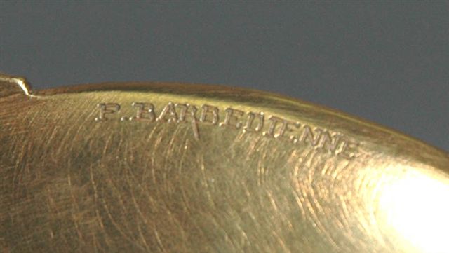 Par Ferdinand Barbedienne, encrier Art Nouveau d'un plateau circulaire à deux anses recourbées. L'encrier positionné au centre est en cristal bleu dans son porte godet à couvercle charnière. Décor floral et prise en fleur bouton de pavot entouré d'un serpent. Signature gravée sur le bord inférieur de la coupelle: F. BARBEDIENNE, fin 19ème. Long. 24, larg. 15, haut. 10 cm. (reproduit p. 39 ref. b 012)