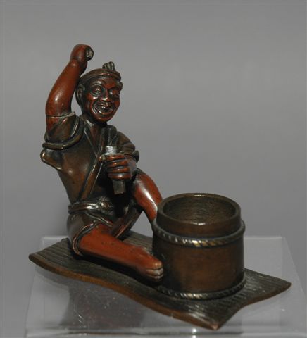 Encrier en bronze de Vienne à patine brune et ocre à sujet d'un joueur de tambour japonais. Le godet encrier est inséré dans le tambour. Long. 9,5 , larg. 5, haut. 8 cm.